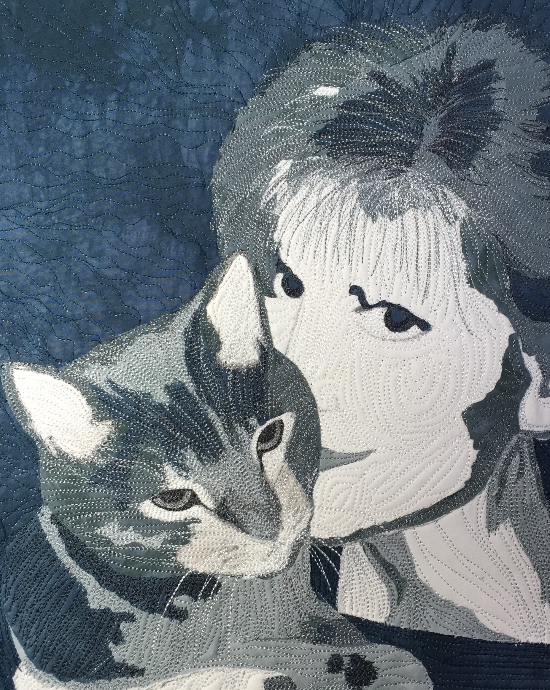 Ingredients: one perfect photo…a range of lovely hand-dyed solid fabrics by Carol Eaton…and every shade of grey “Magnifico” thread manufactured by Superior Thread! My husband snapped this photo of me with my most-beloved grey cat some years ago. I came across it recently and thought it would make a lovely study in multiple shades of grey.