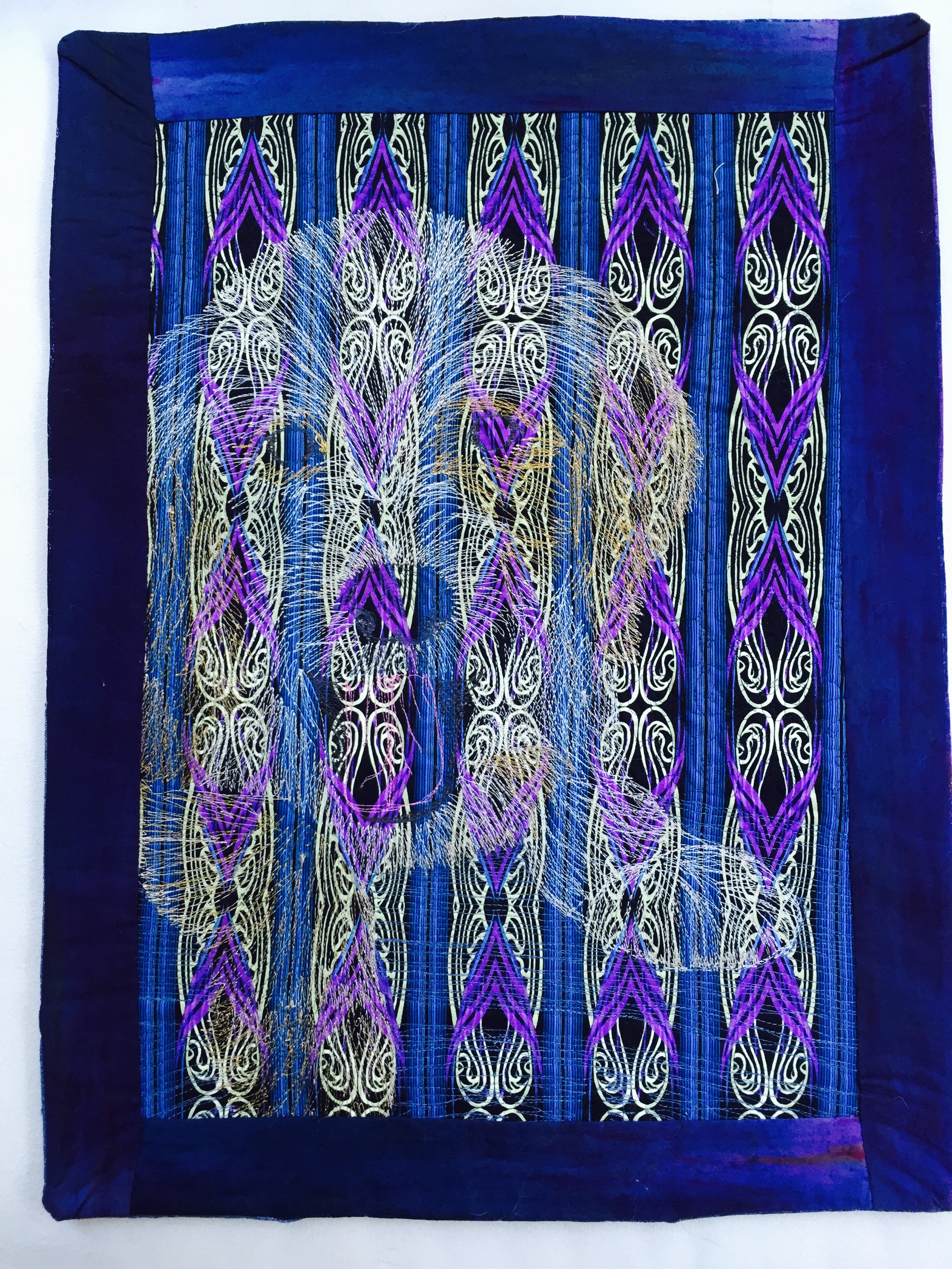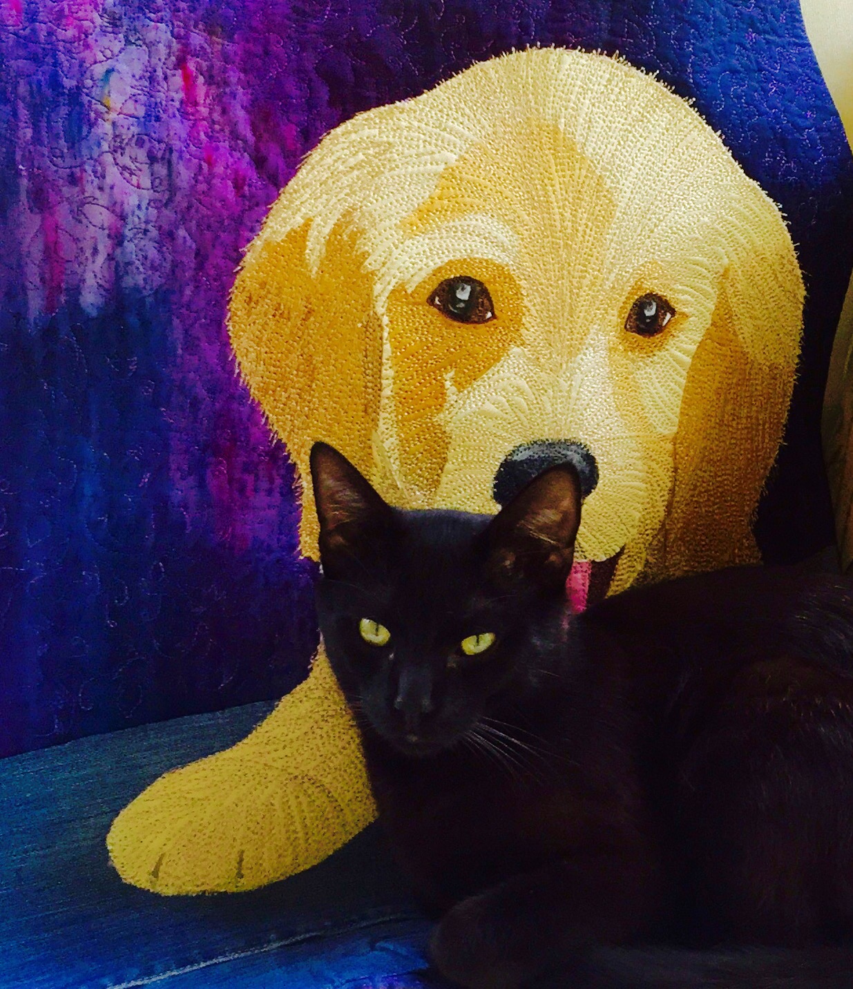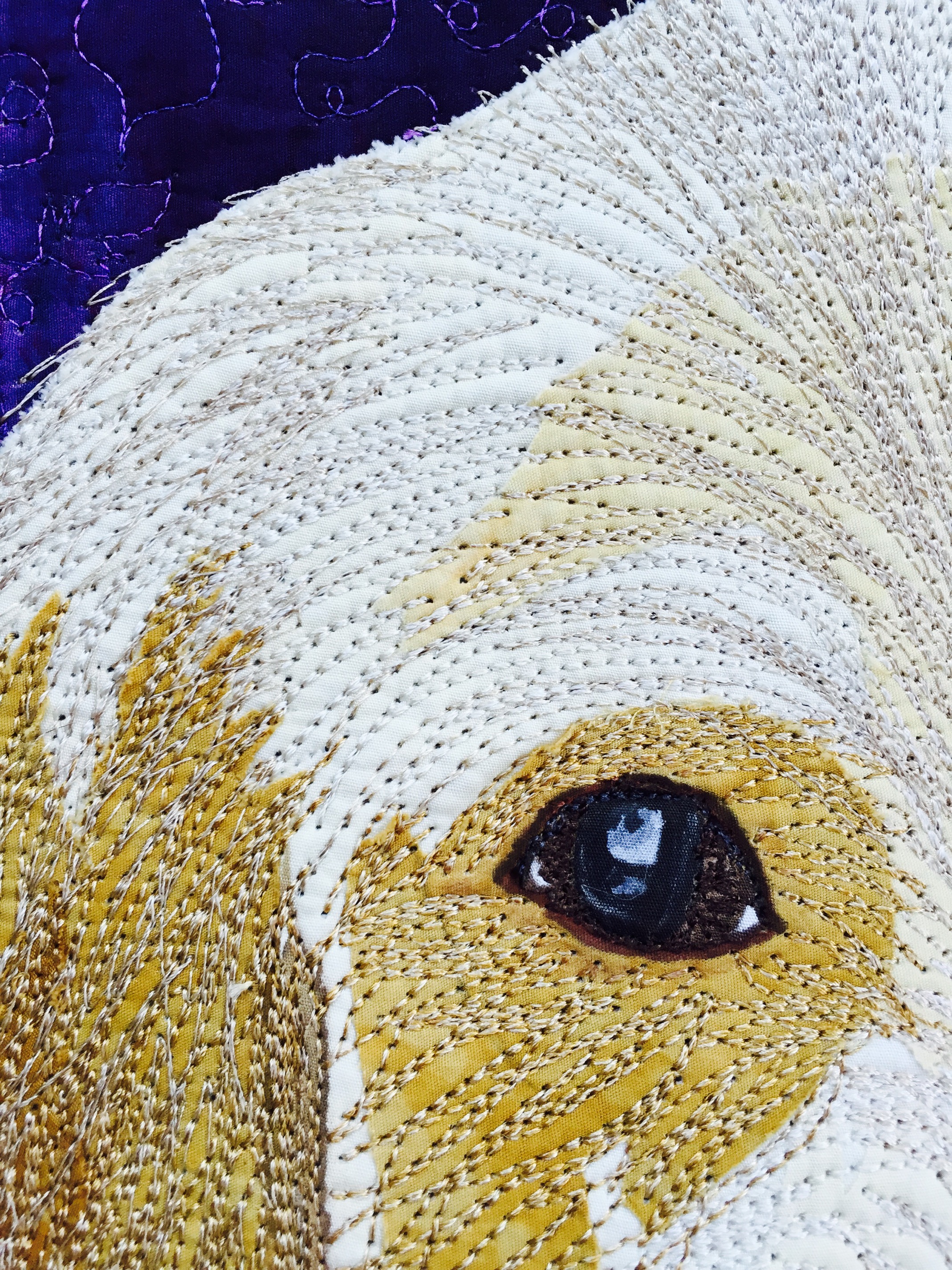 Carol Eaton’s hand-dyed fabrics- solids to match the subject, spectacular confetti-dyed background :