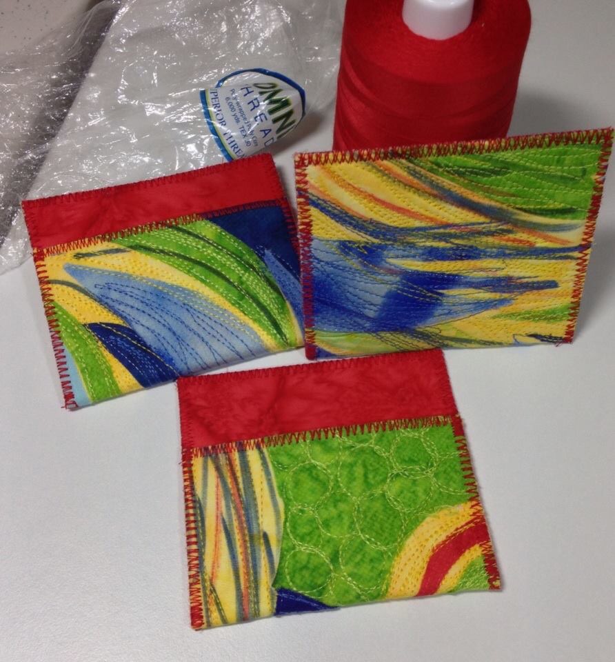 BUT…I loved the colors…and decided I could chop bits of it out to make mini-wallets. Carefully harvesting as many 4 1/2″ by 6 1/2″ pieces as I could, I fused them to pieces of stuff fusible, backed them with a coordinating solid, folded them and stitched around the edges.