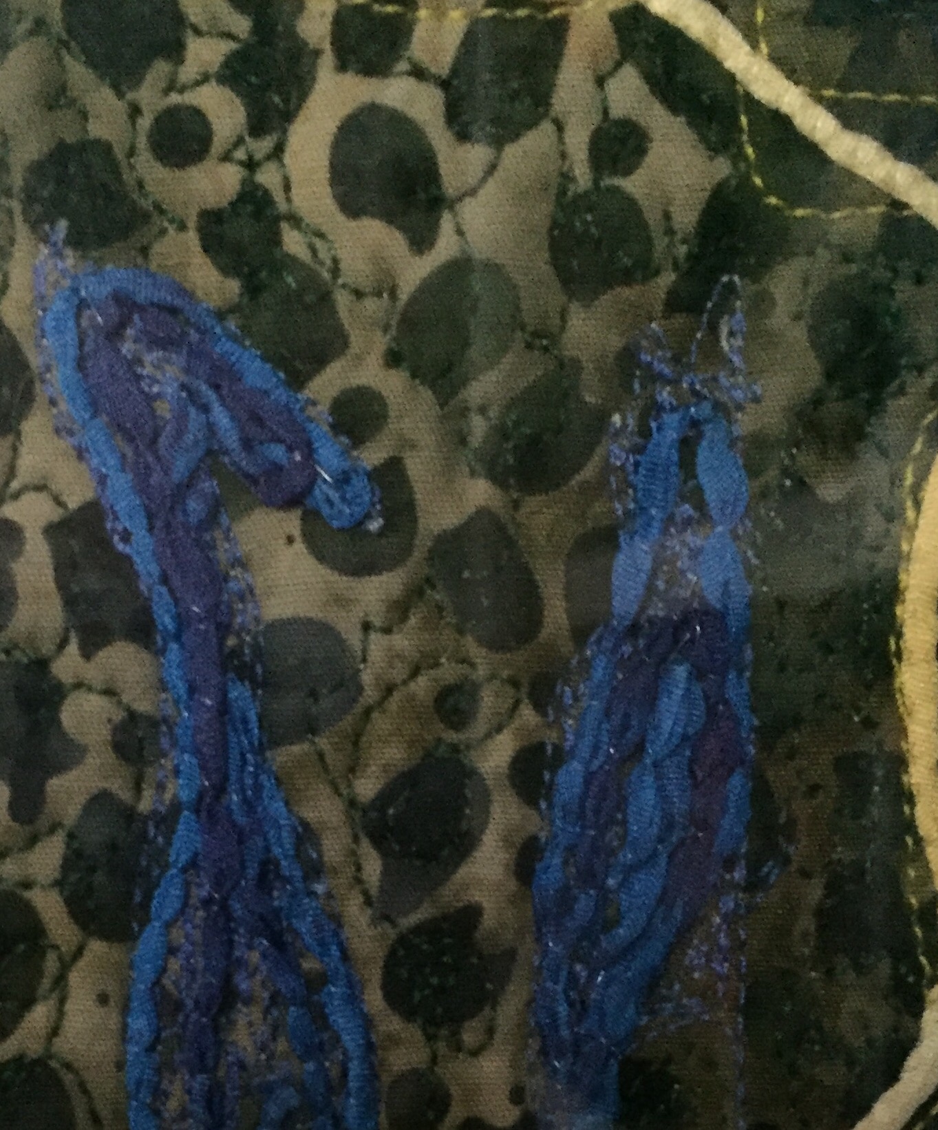 First, I free-motion quilted all over the surface with green thread…a simple repetitive pattern to suggest tree tops.