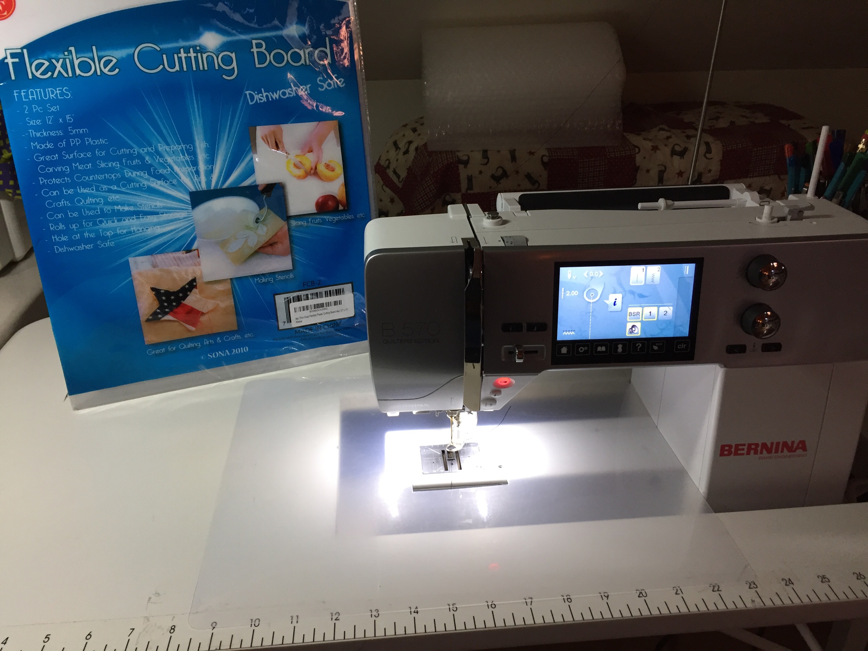 Next step…how to improvise in those custom-cut clear inserts that fit around your free-arm and provide that seamless surface?  As I stood in a kitchen supply store, I stared at a package of (v v inexpensive) flexible cutting surfaces – sometimes they come in assorted colors.  Hmm.
