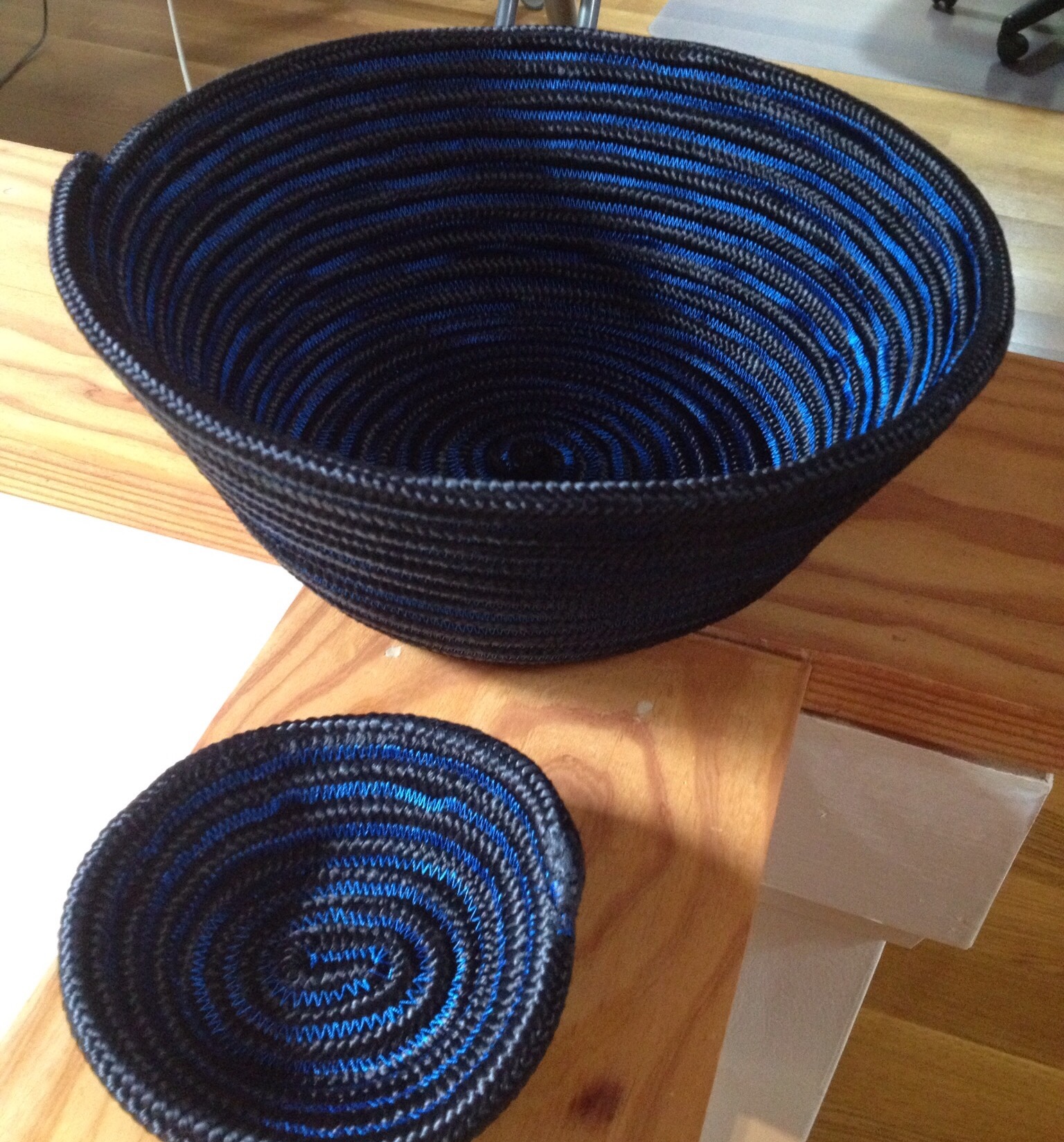 So it was another afternoon in the home improvement store, husband off in Aisle 356 hunting for another inexplicable (to me) item. I wandered into the aisle containing colorful polyester rope and thought, aha, bowls.