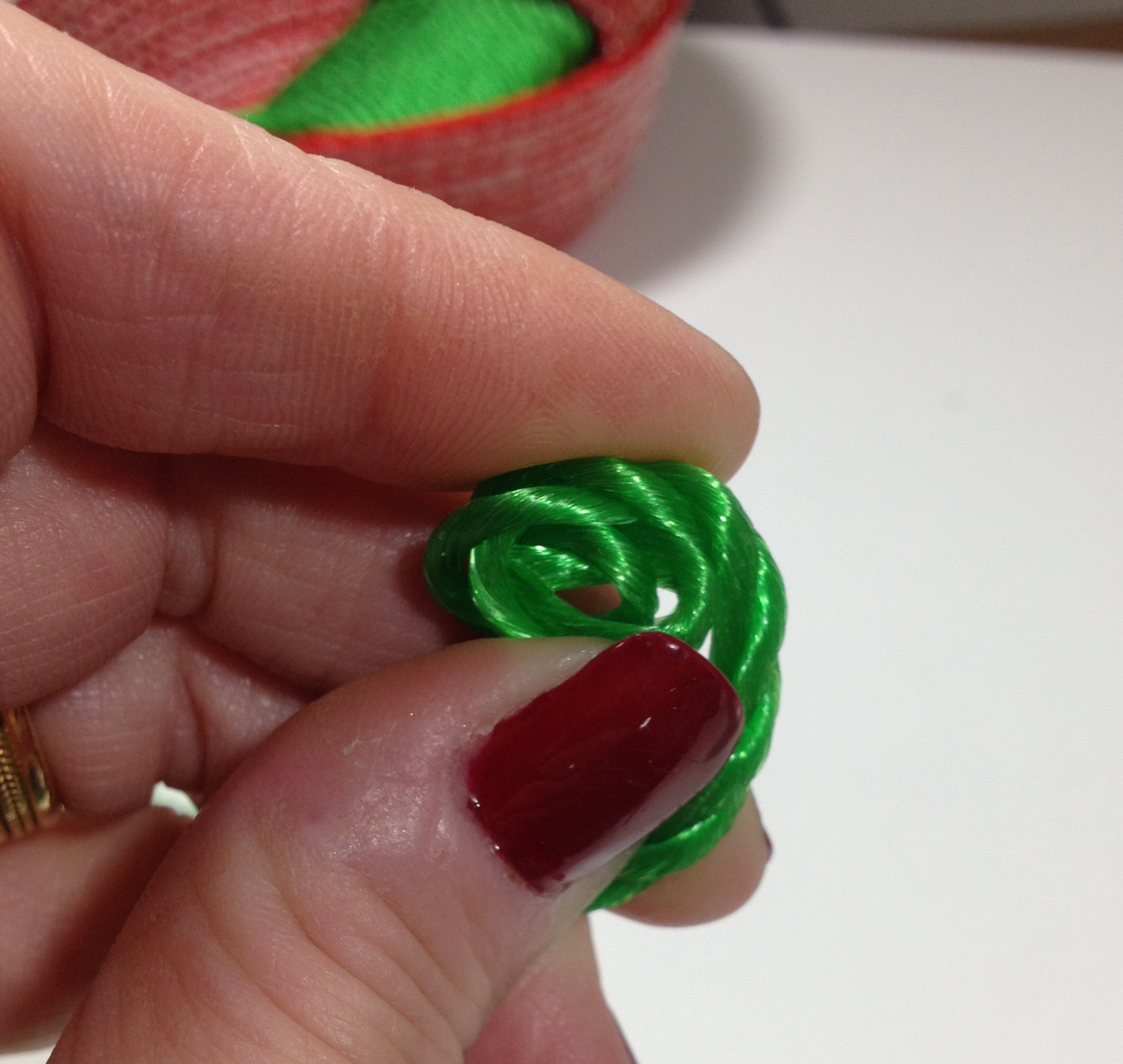 - Use a strong thread…I like to use fairly heavyweight (at least 40wt) threads. Shiny trilobal polyesters (like Magnifico by Superior, shown in the photo below) create a beautiful effect if you send a tight stitch…for the red and green bowls I used Superior Threads’ Metallic, another favorite of mine
