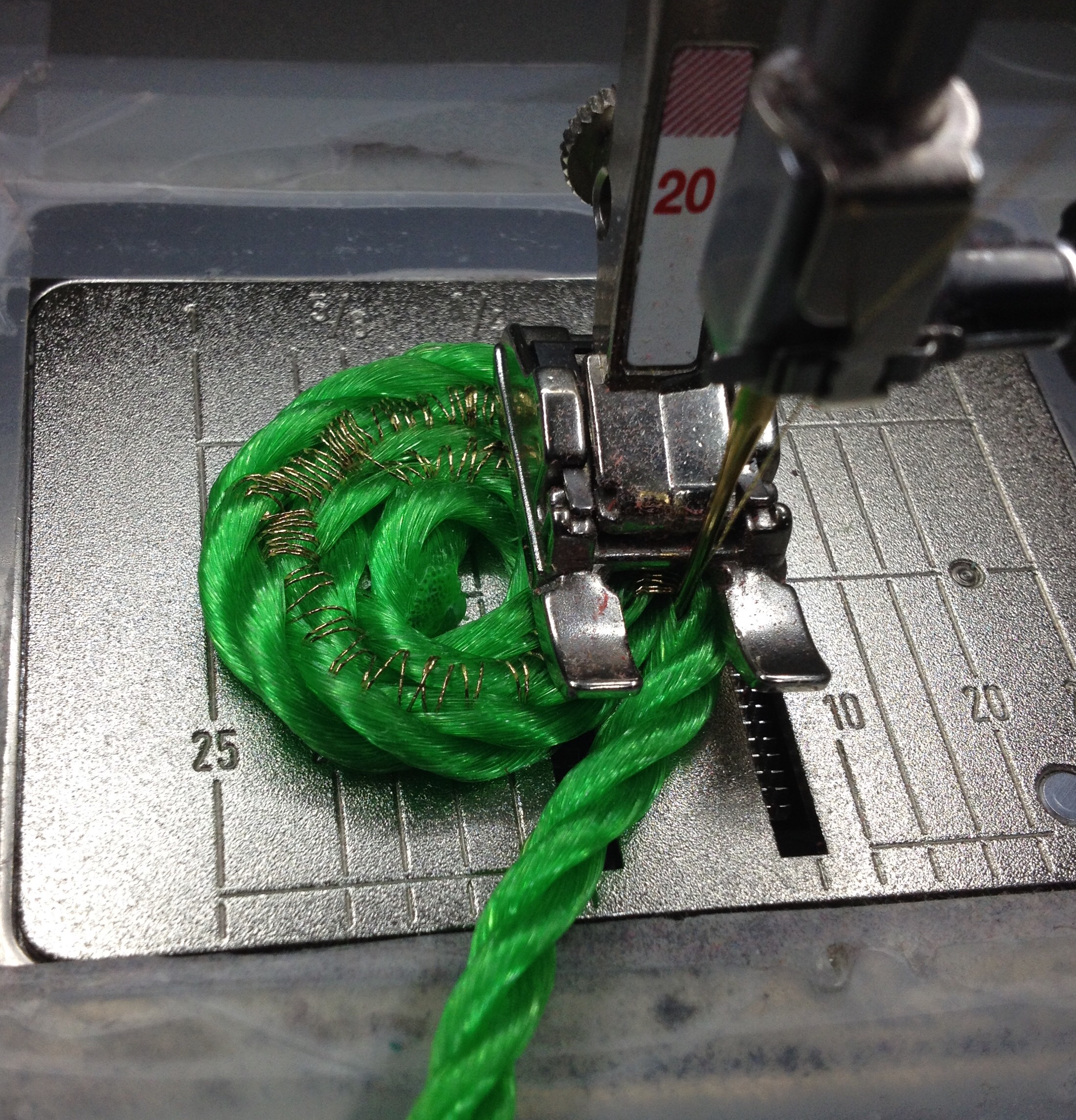 I find it easier to cool the rope in a clockwise pattern. You will need to hold onto this very tightly, and it helps to increase the presser foot pressure at the beginning. Zig-zag stitch very slowly at first:
