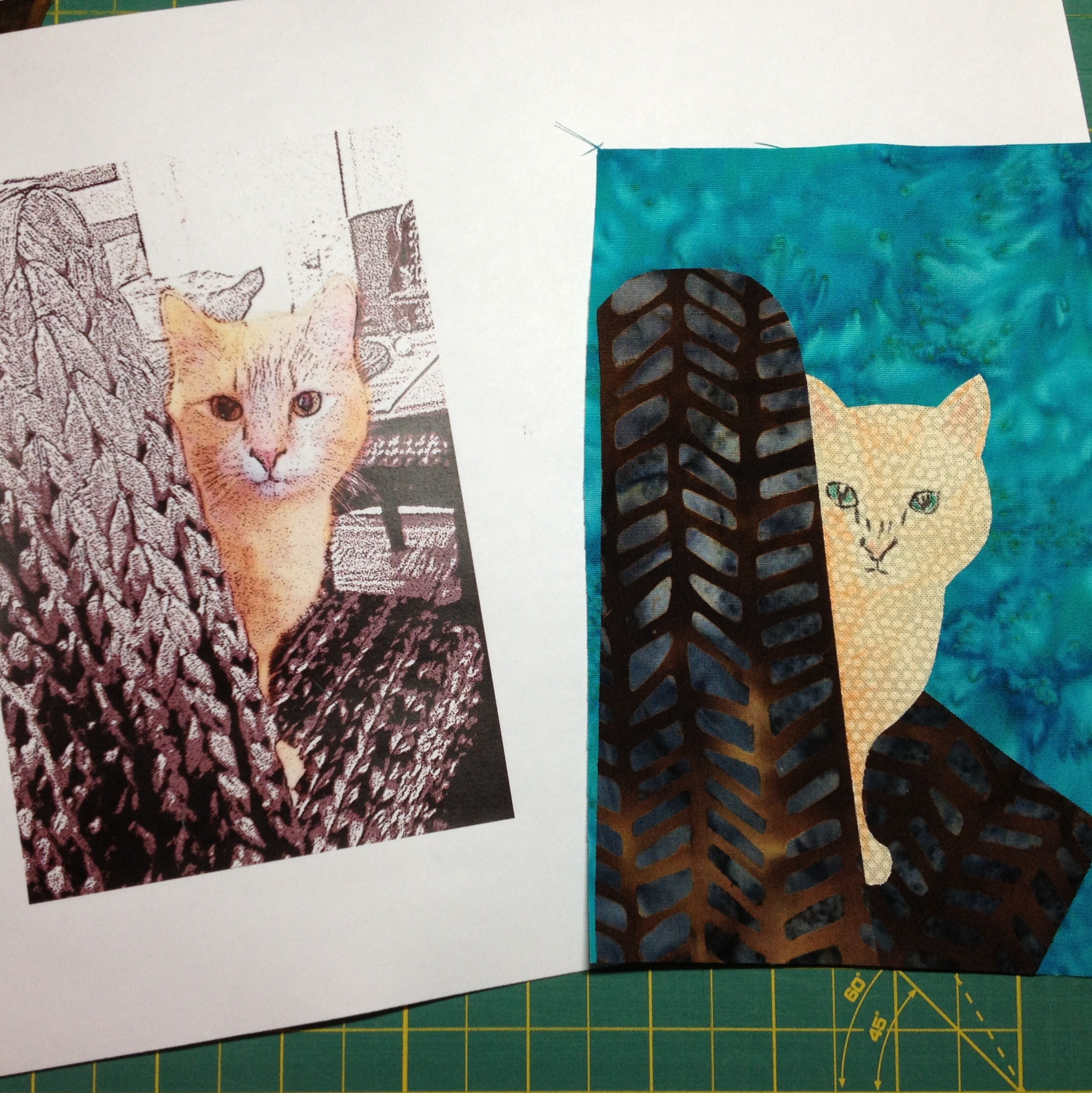 If your subject is mostly monotonal instead of dramatically striped, it can be fun to simply cut one piece of fused fabric for the furbaby. Here the white chin and paws were provided by a white marking pencil (since I never mark my quilts, it came in handy) and a few facial features were carefully inked in (using a light box to trace the positioning of the eyes and nose first).