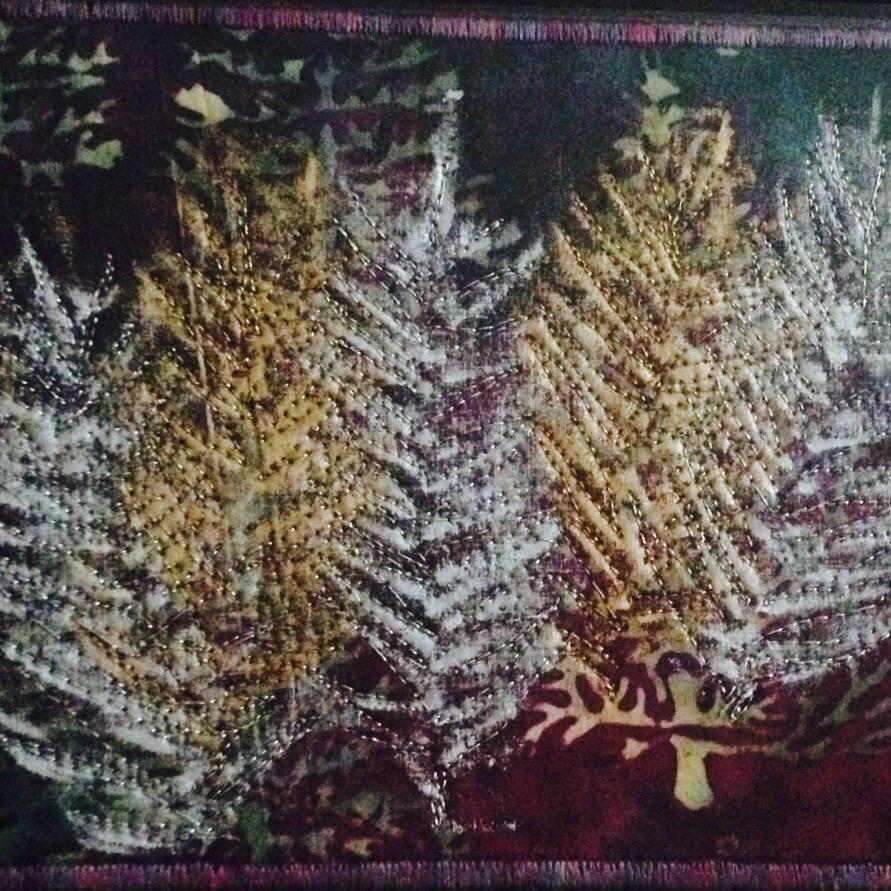 Your Christmas tree can, quite literally, provide inspiration for art quilts. One year we needed to trim away a few small errant twig/branches from the trunk. I looked at the bits of Douglas fir in my hand and decided they would make an excellent rubbing surface for my PaintStiks (and a lovely memento of a particularly pretty tree).