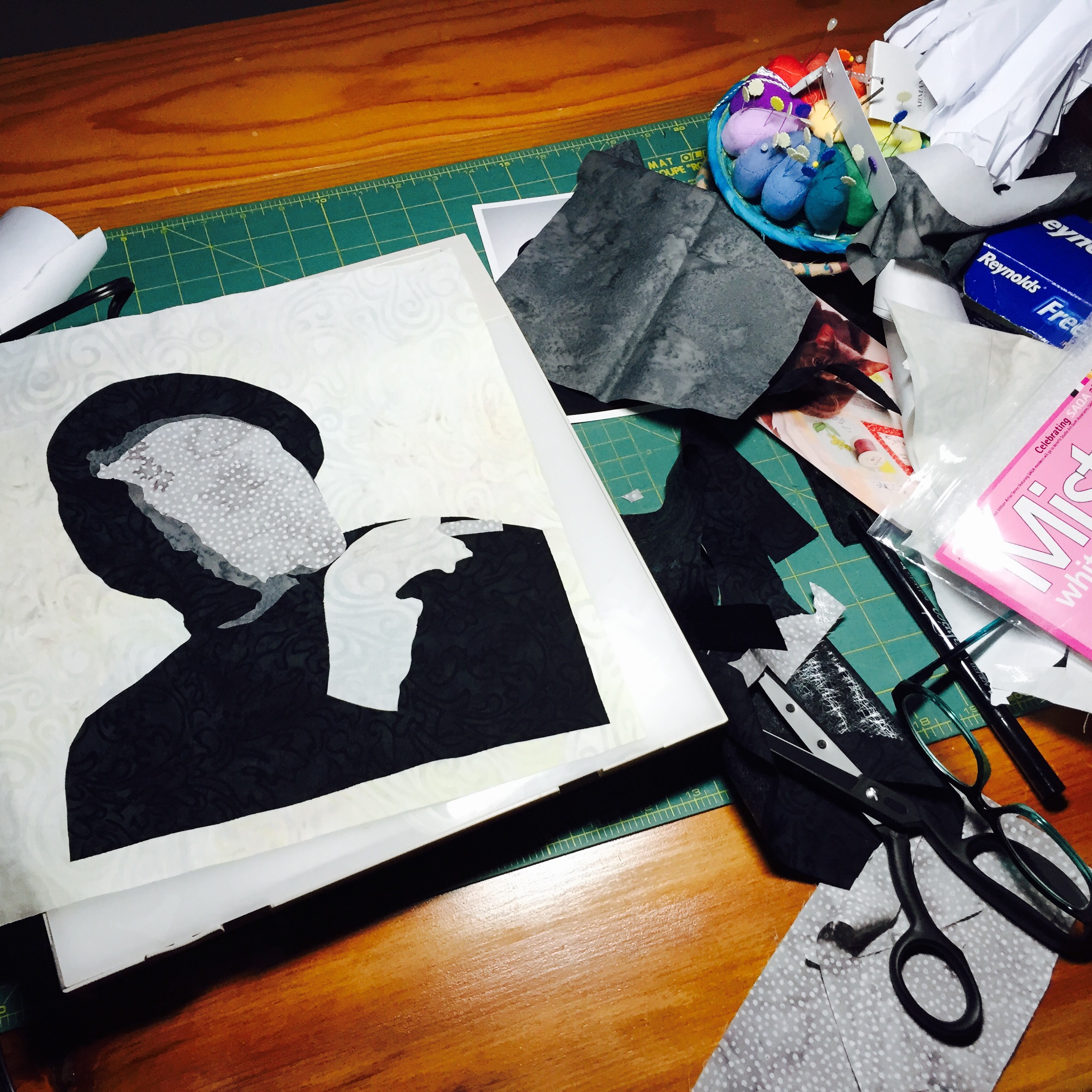 Then, time to MistyFuse the selection of fabrics (I chose a range of greys to honor the original photo) and trace a pattern with freezer paper-
