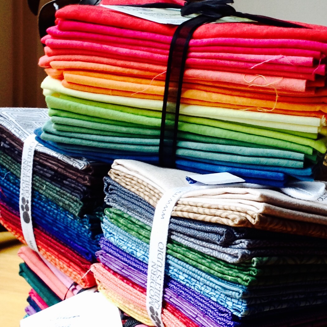 Experience brings wisdom and -for me- an acquaintance with hand-dyed fabric. This rainbow stack of fabric is now my paintbox. Blender batiks play nicely, too, as do shot cottons. My purchases of patterned fabric are now extremely rare…I still fall in love, but wisely now (Victoria Findlay Wolfe, Weeks Ringle, Lynn Krawcyk, Janine Vangool…certain artists’ collections just sing to me). Ok, ok, Christmas fabric does NOT count ;).