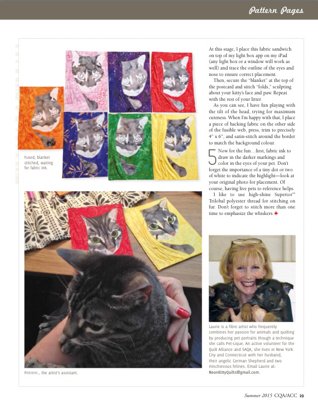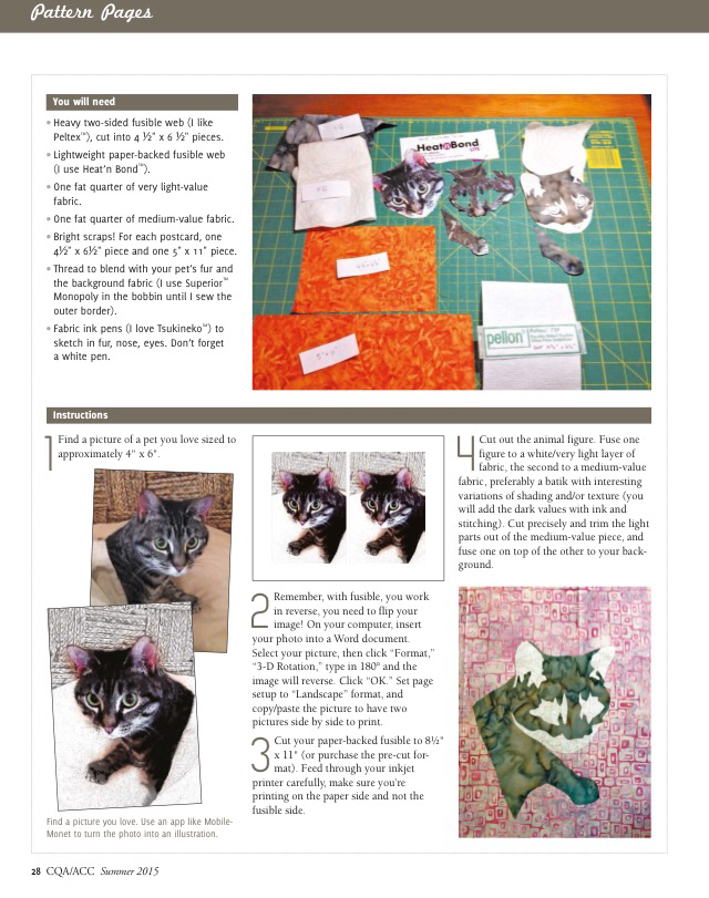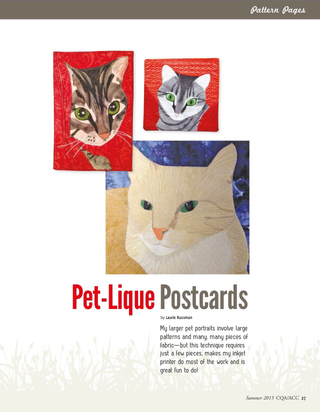 Weeks Ringle just announced a very exciting project for Spring IQF…pet postcards to benefit PAWS, the very wonderful Chicago-based organization. The link to my pet postcard tutorial is mysteriously broken (one of the places Weeks suggests to go for ideas). While I attempt to learn more about WordPress in a hurry 😳, here is the article on the same topic from last year’s Canadian Quilter magazine (thank you again to CQA for allowing us to use it!!)