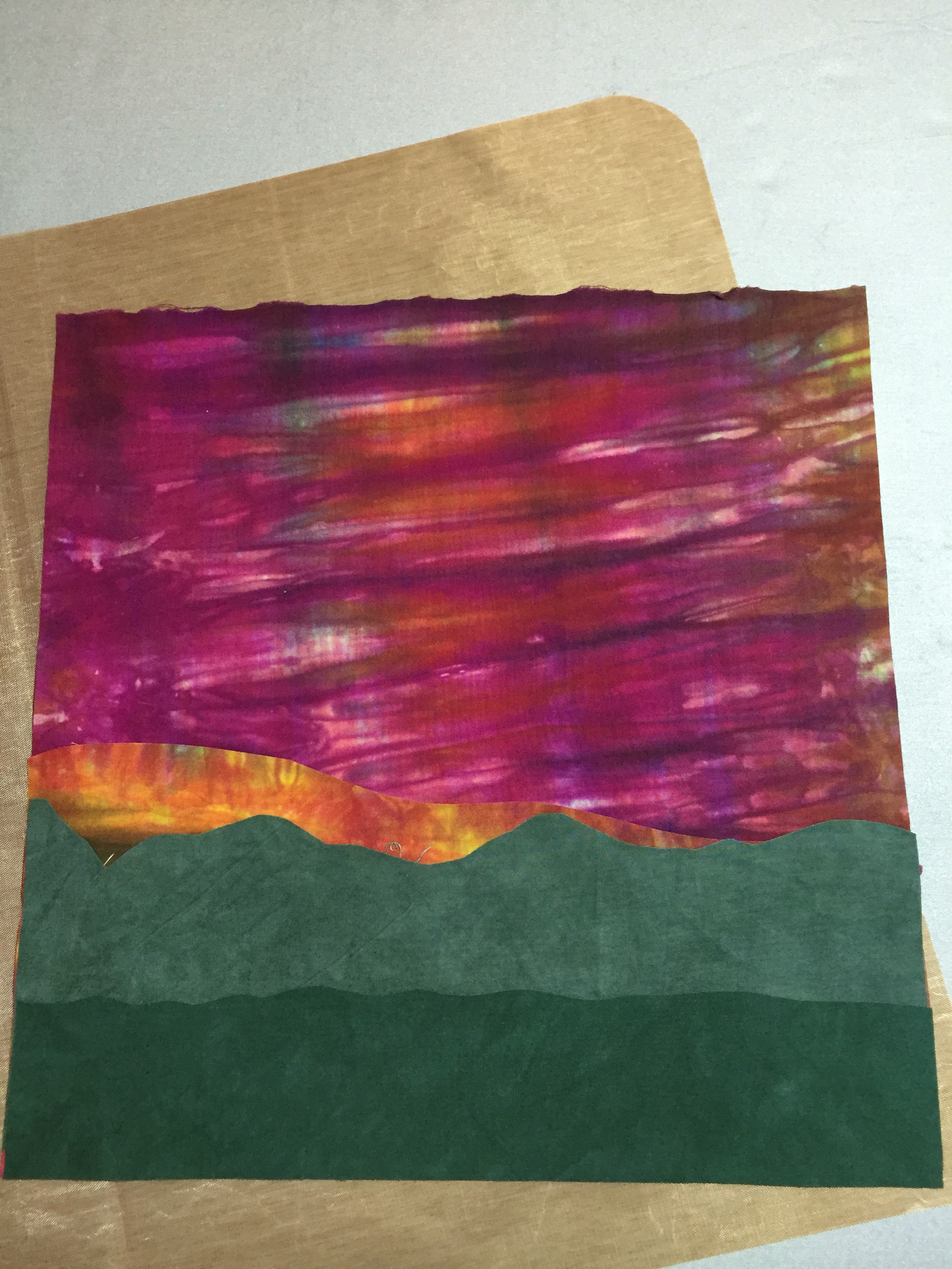First step, MistyFuse all fabrics. Then, step back and take a look at this shibori piece…where do you see the sunset?