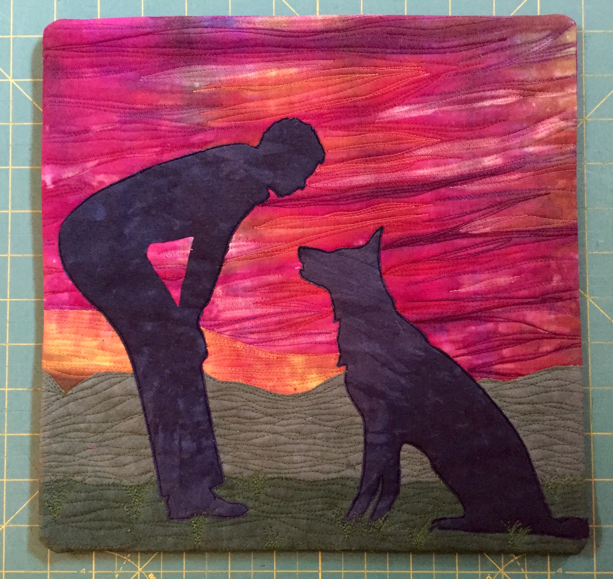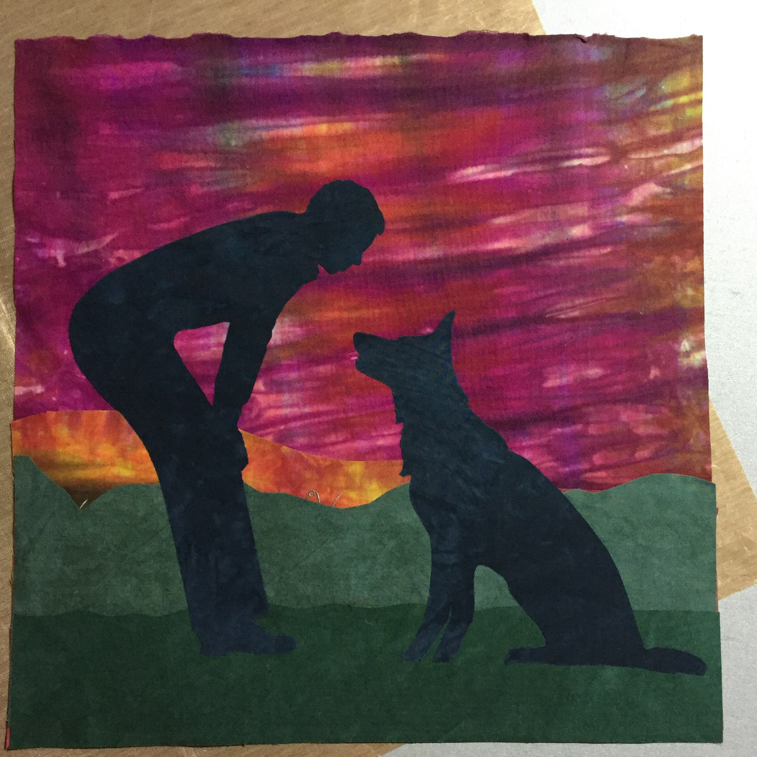 Landscape done, now for the main characters. I enlarged a lovely shot that showed a person and dog in silhouette…traced into freezer paper…pressed to the dark grey fabric…and cut out very very carefully…positioned onto the background…and fused.