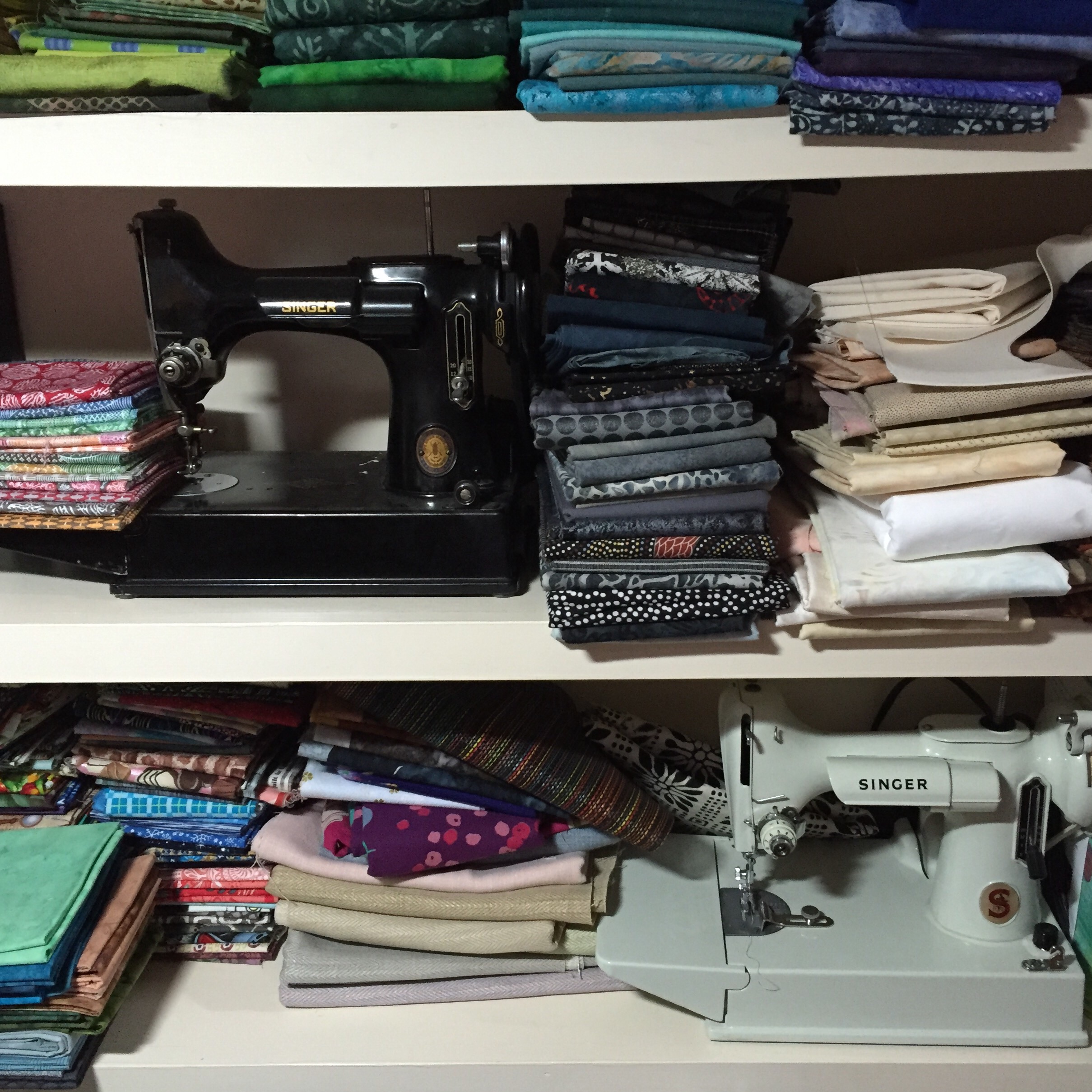 And, most precious of all, the Featherweights that belonged to my mom and favorite aunt. I learned how to sew on that black machine…and sometimes imagine the two machines gossiping with one another about those newfangled behemoths on the other side of the room :).