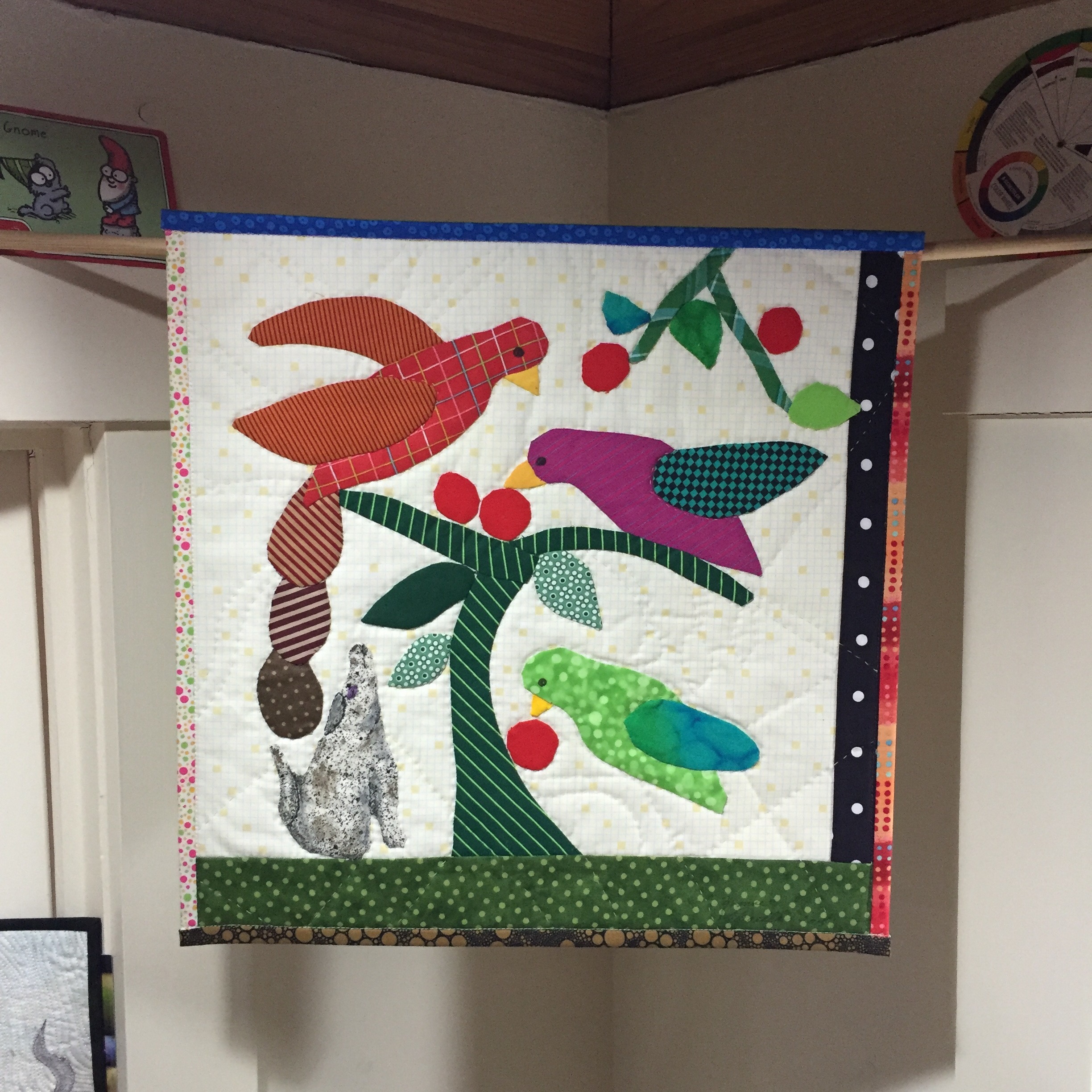 My most prized possession is the quilt created by Yvonne Porcella, pictured above, “Oski Loves the Birds.” I was on a mission to win this piece during the auction of the Quilt Alliance’s contest quilts last year. This piece is not only lovely on its own but represents the spirit of one amazing lady who paved the way for our tribe…I was so fortunate to be able to get to know her in person. (See what treasures you can find in the Alliance’s auction? Watch this year’s bidding to find the artist who inspires YOU!)