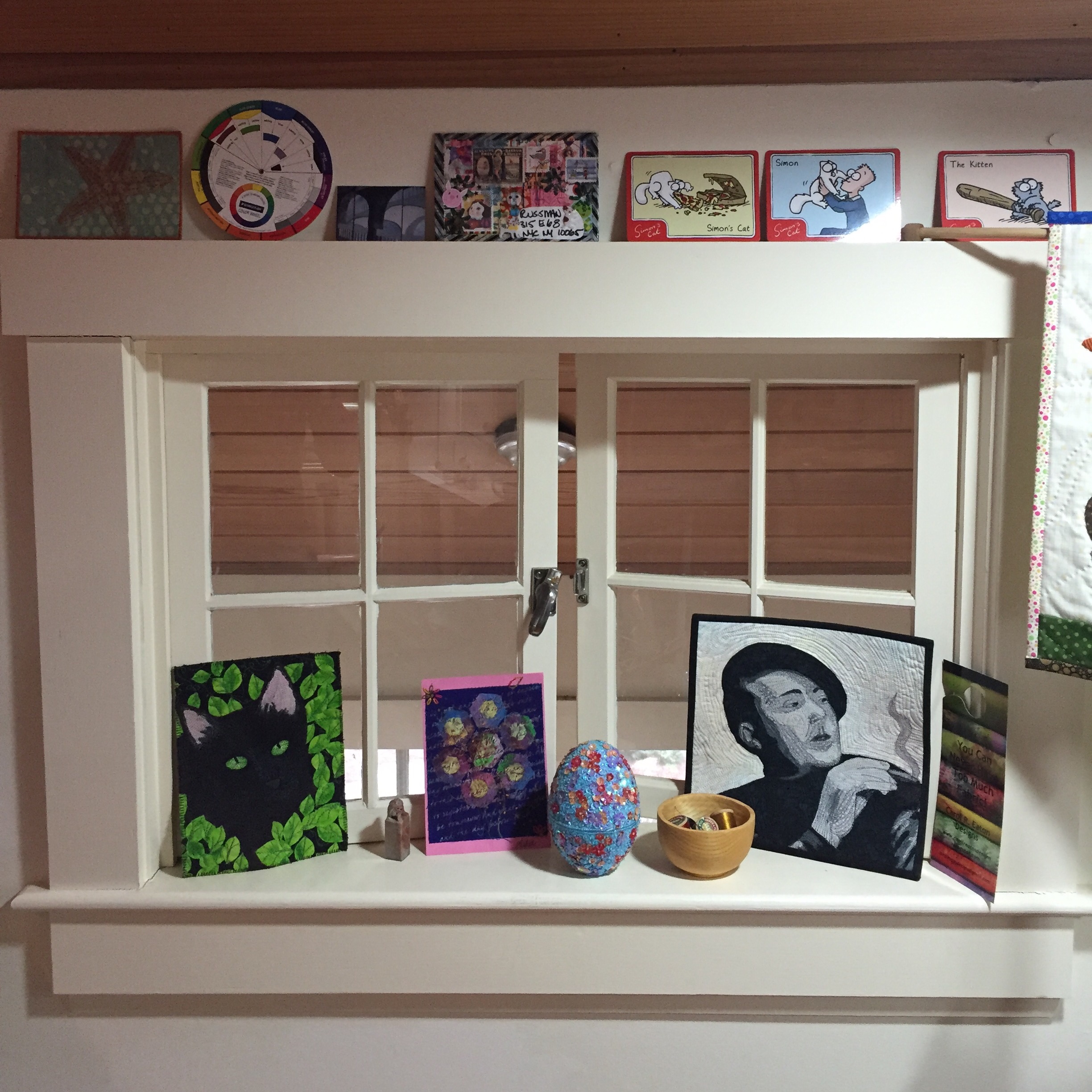 I have an internal windowsill that holds treasures and reminders of just a few of the wonderful friends I’ve made within our community. And, yes, Simon’s Cat ;).