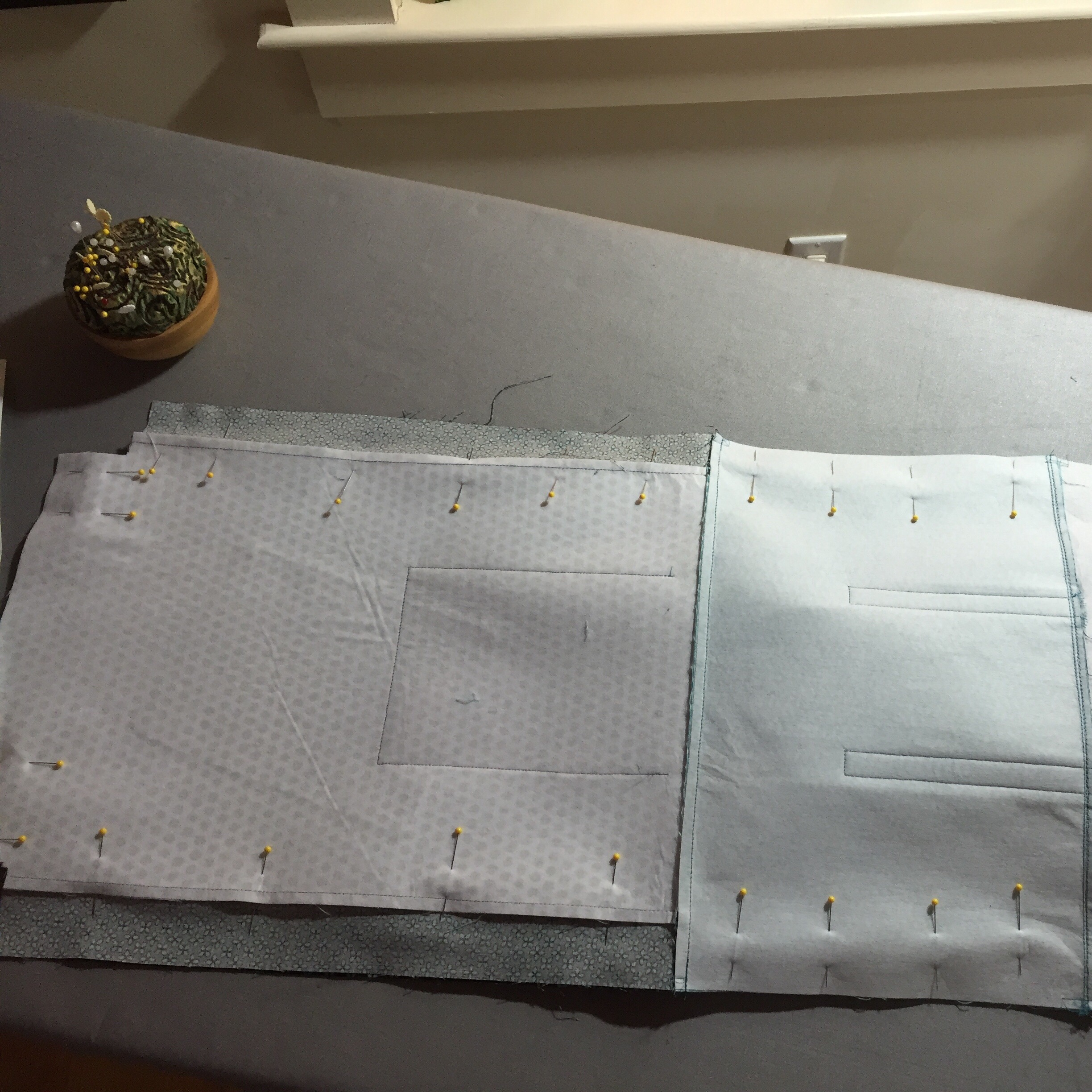Join the outside and lining layers…then the pincushion comes out. Art quilter that I am, this is pretty much the only time I use pins 🙄…except for loading quilts onto my longarm of course. The pattern gives lots of helpful tips so that you end up with something that looks like this: