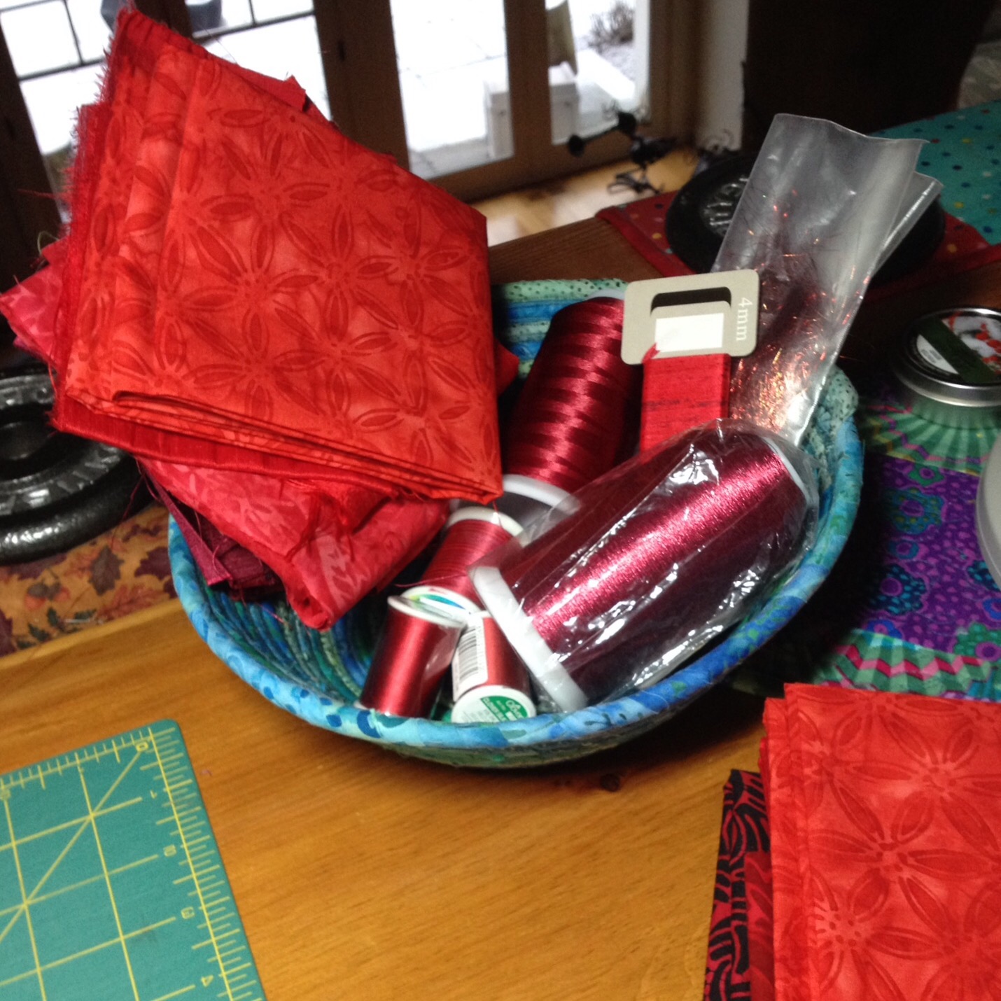 I should note that this was before I discovered the wonders of MistyFuse, so I had to work in reverse for my paper-backed fusible. Next step, gather my reds from my Superior thread stash and head to my local quilt shop and buy LOTS of fat quarters of reds for that bow…