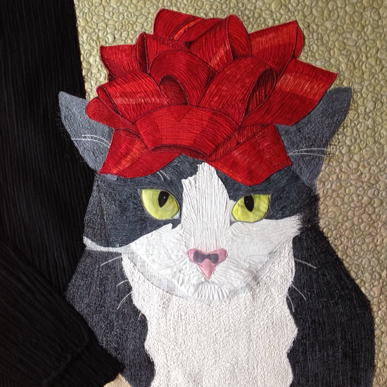Next challenge, the background (which was too busy in the original photo). I opted for a batik background that would contrast nicely with all of those reds, and added a suggestion of a human holding her by stitching in a cashmere “arm,” bit of body and hand. The inside joke about the cashmere is that is was thoughtfully provided by my feral cutie, who had chewed so many holes in one of my sweaters that it landed in my stash. It was a flat surface so I quilting in a cable pattern and “cuff” for fun: