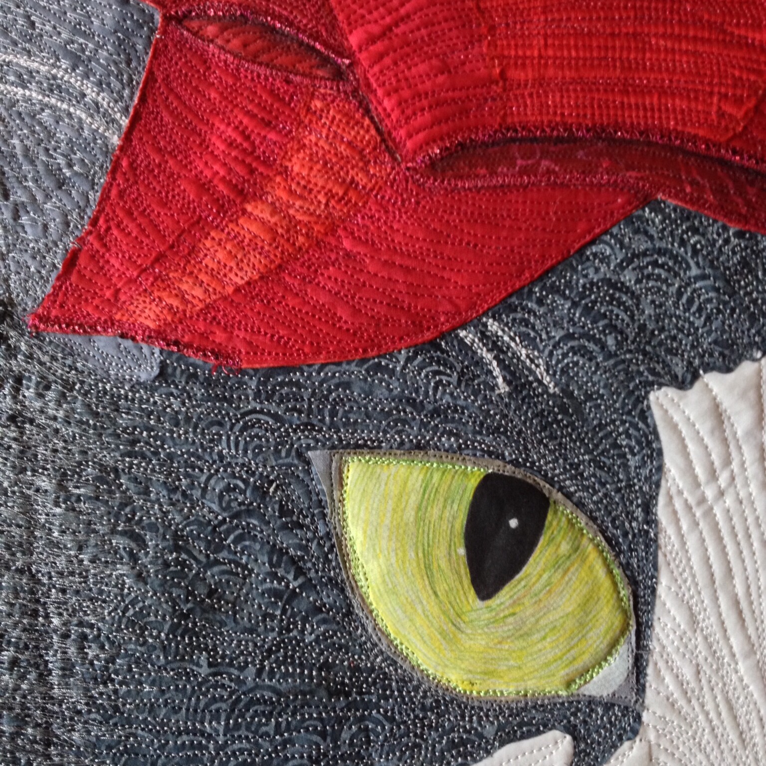 My studio is still full to the brim with WIPS related to my Really Big Project ;)…all to be revealed soon! Because one of my favorite cats makes an appearance in the current issue of Quilting Arts magazine- a fast and easy way to create a pet portrait- I thought I would share my original interpretation of Ruby, titled “Unforgiven” (created for IQF’s “Raining Cats and Dogs” 2014 Special Exhibit).