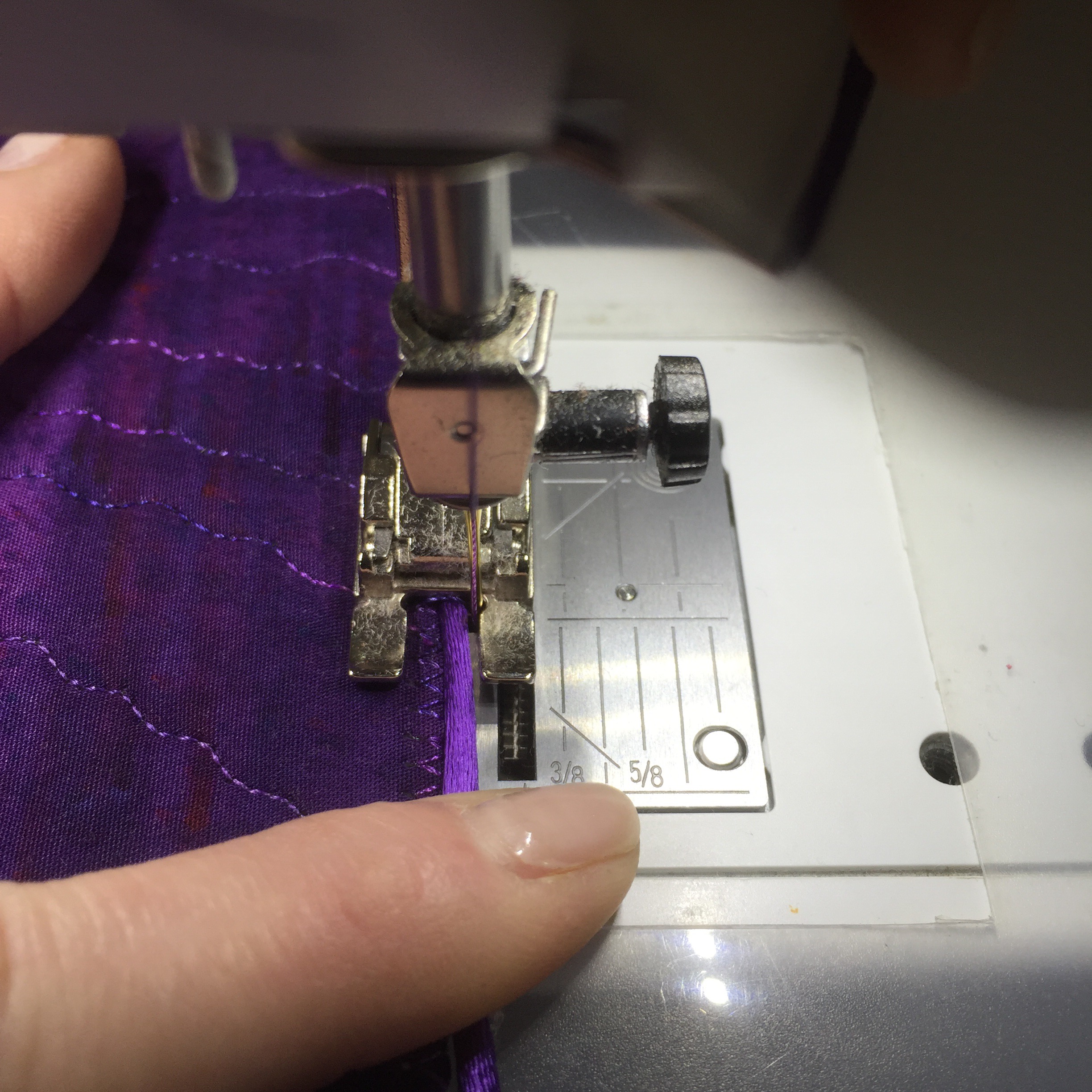 - Then, set the width of your stitch to maximum and lay the cording along the side of your piece. Hold it taut as you stitch: