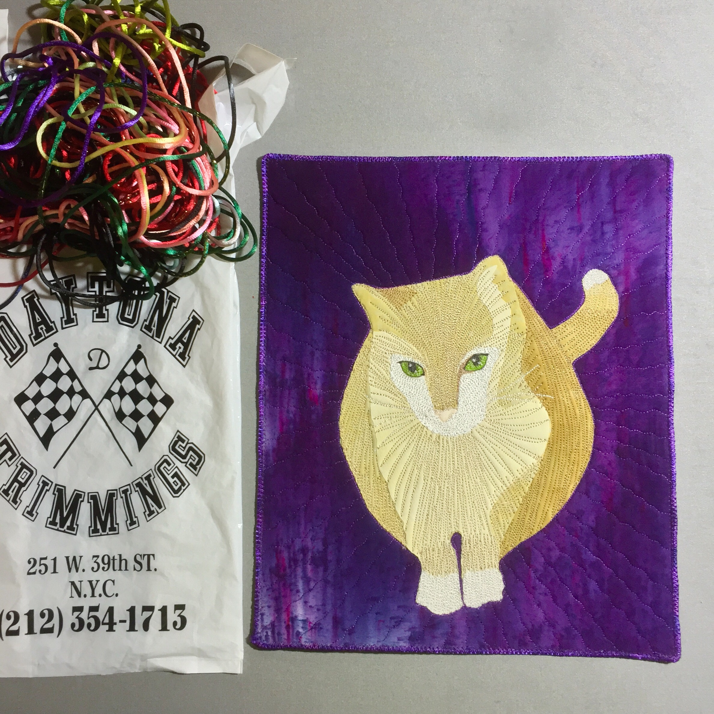 One of my favorite ways to finish small pieces uses inexpensive cording from a terrific trim shop in the garment district –address shown above for your next trip to NYC. (An added bonus in this store is the presence of two shop cats named Rick and Rack ;).) I keep lots of different colors in my studio.