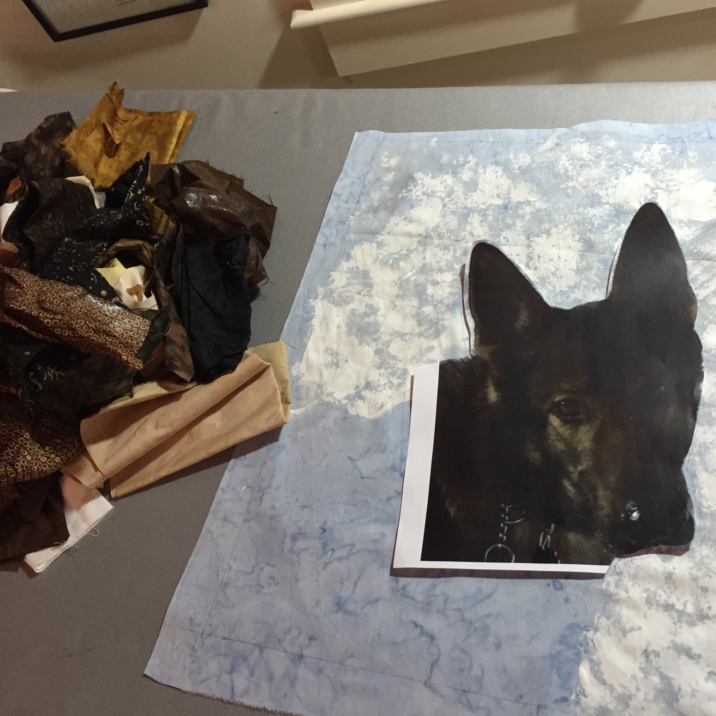 Then, out came every scrap of fabric in my German Shepherd category, which I placed next to printouts of both the illustration and the original photo to block out the chest, neck and head: