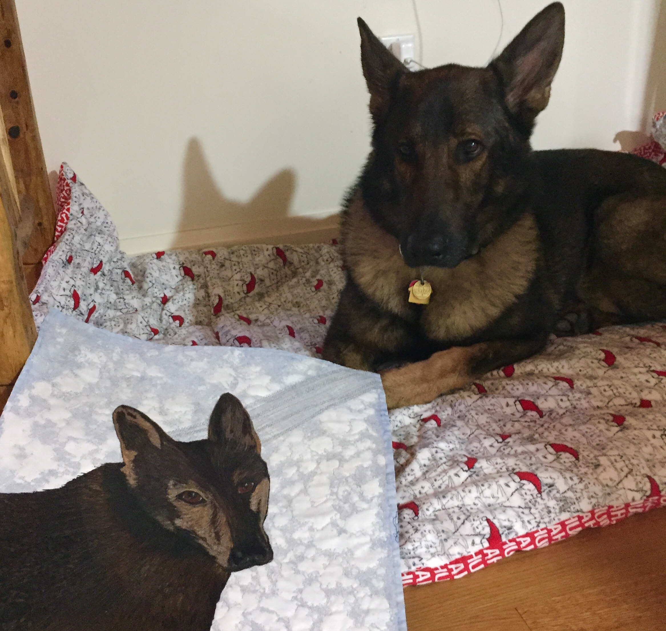 LOTS of stitching! I find dog faces to be much more complex than cats…and there are dozens of subtle colors in this handsome face. Fortunately the model was happy to assist…and, of course, Jesse had his opinions.