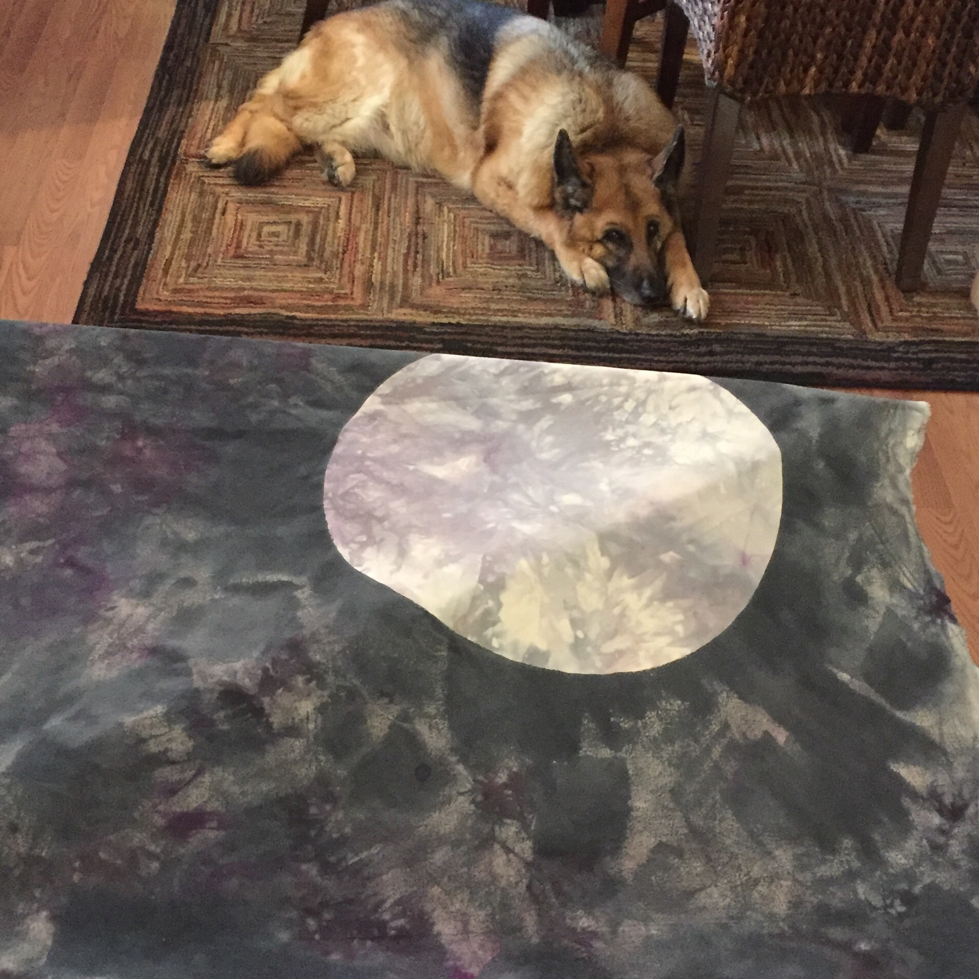The night sky was less obvious given the very pale indigo hue of Rebecca’s fabric…until I took Judy Coates Perez’s amazing all-day class on using fabric paints. I spread out a plastic dry cleaning bag on the floor, then taped the fabric (cut to slightly larger than my desired finished size) down. Lots of blue and black and iridescent paint stirred together and a full moon (freezer paper pressed to the fabric) and we’re good to go: