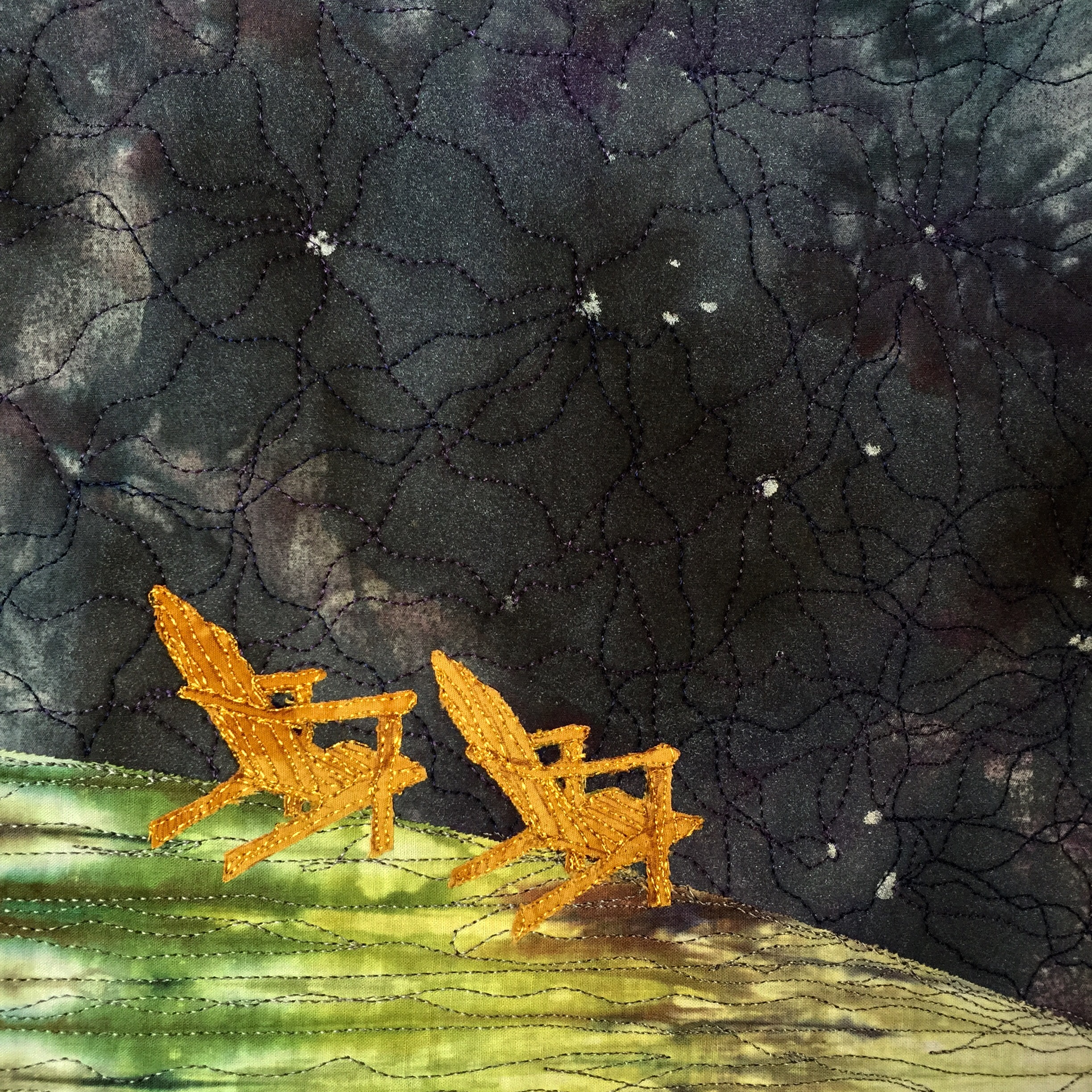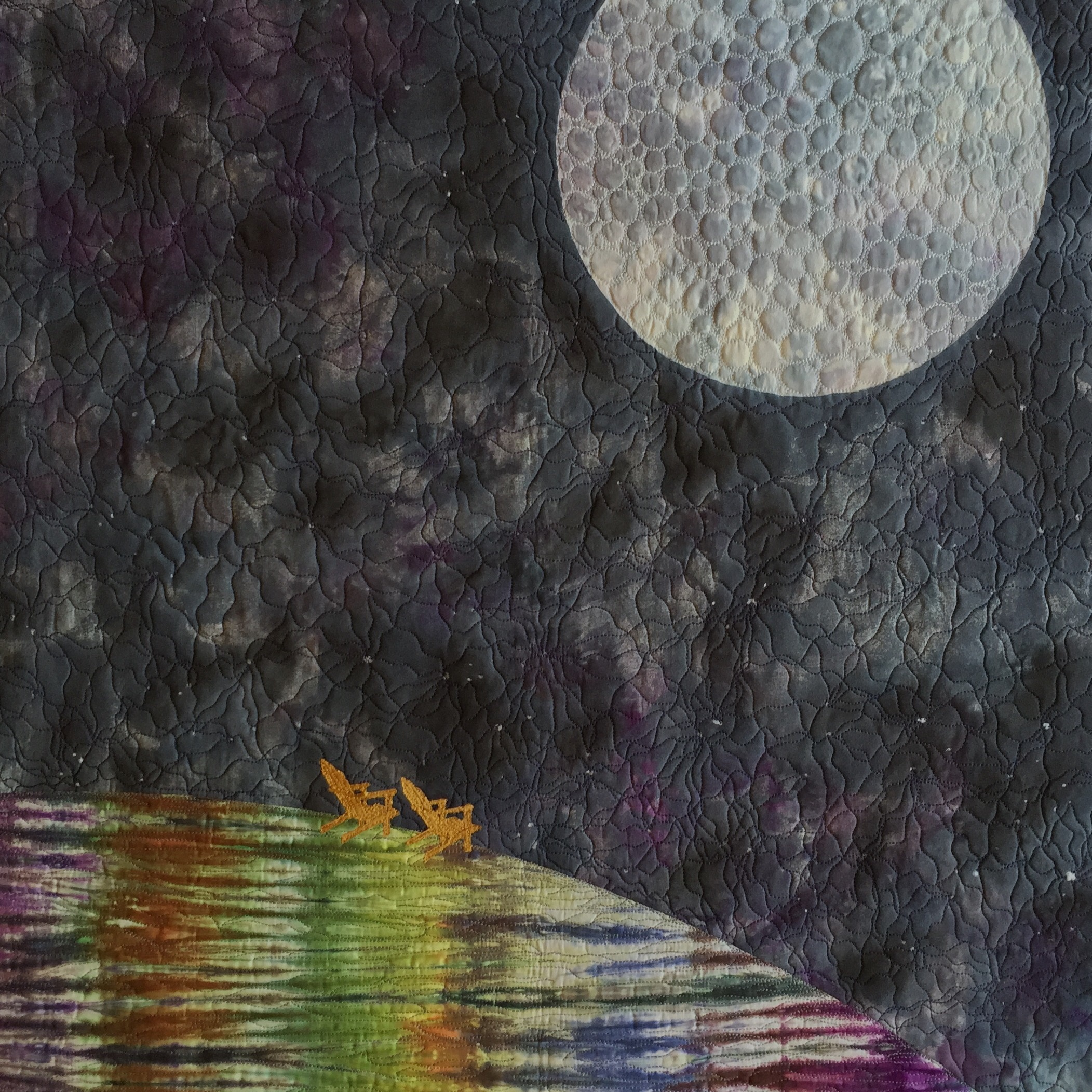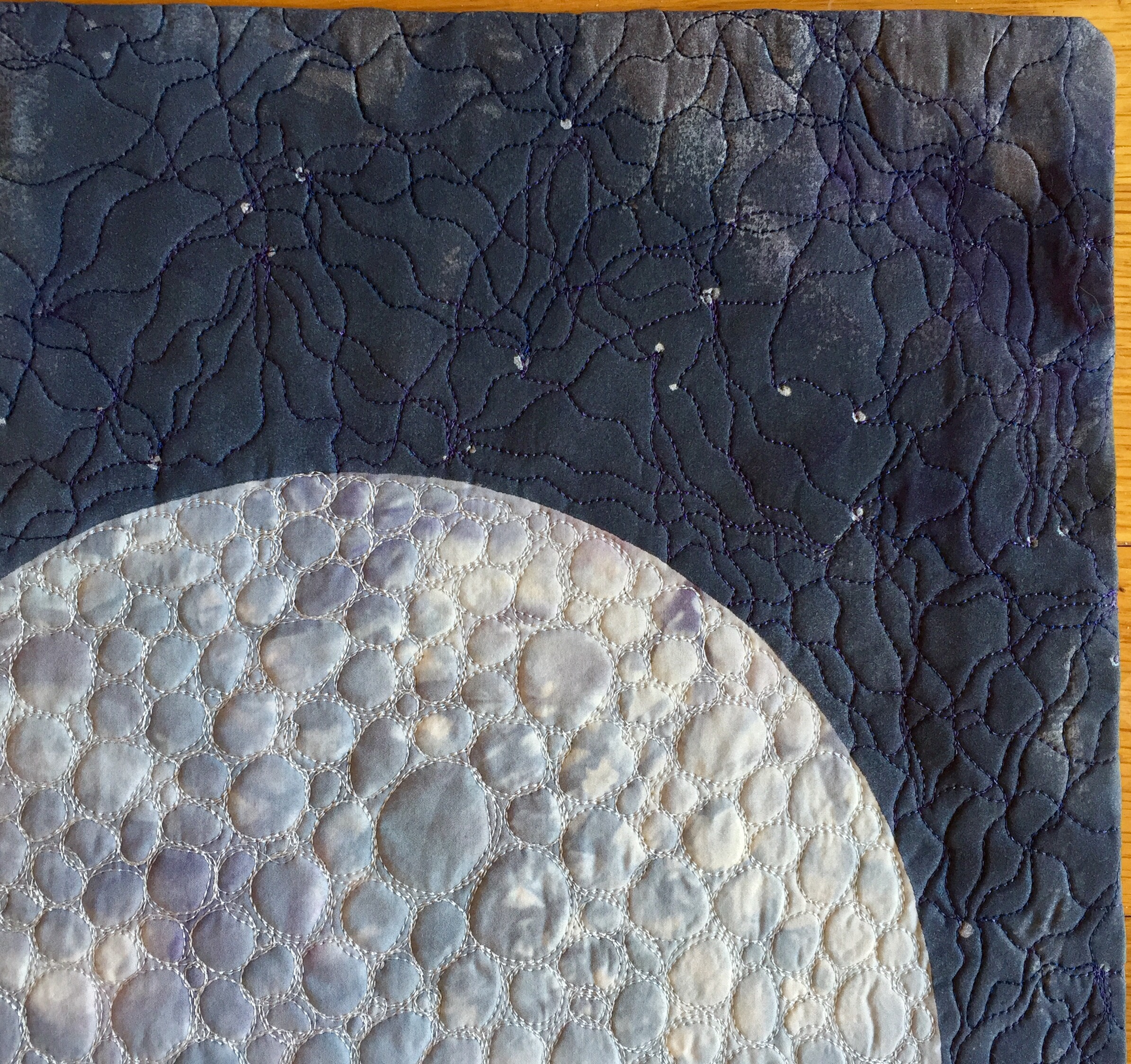 (Sorry, forgot to take a picture of the threads for the “planet.”) the quilting patterns were very simple: lots of almost-horizontal lines to enhance the shibori pattern…big pebbling on the moon with both of those threads run through the needle…and simple wandering paths in the night sky to connect each and every star, representing the connections amongst us.