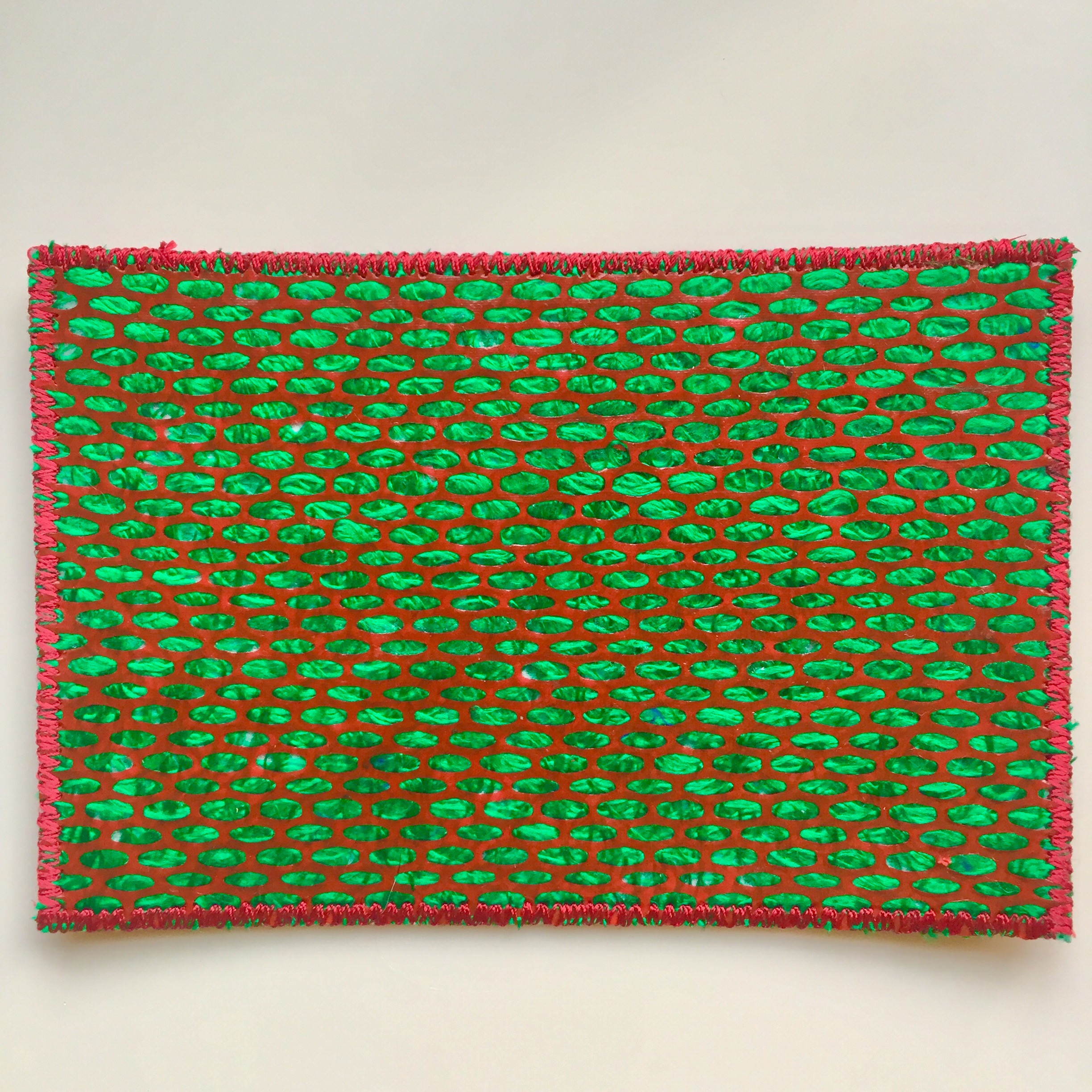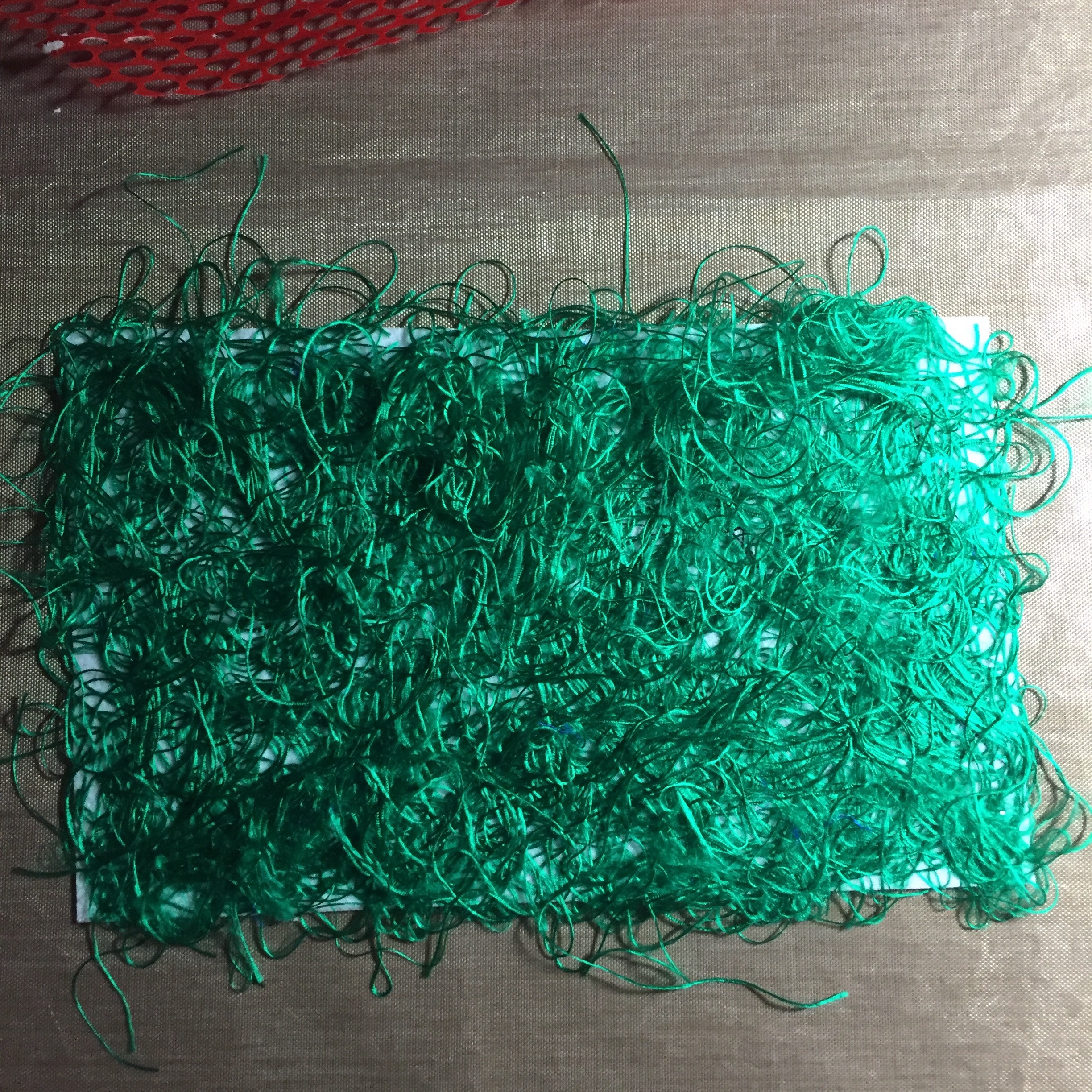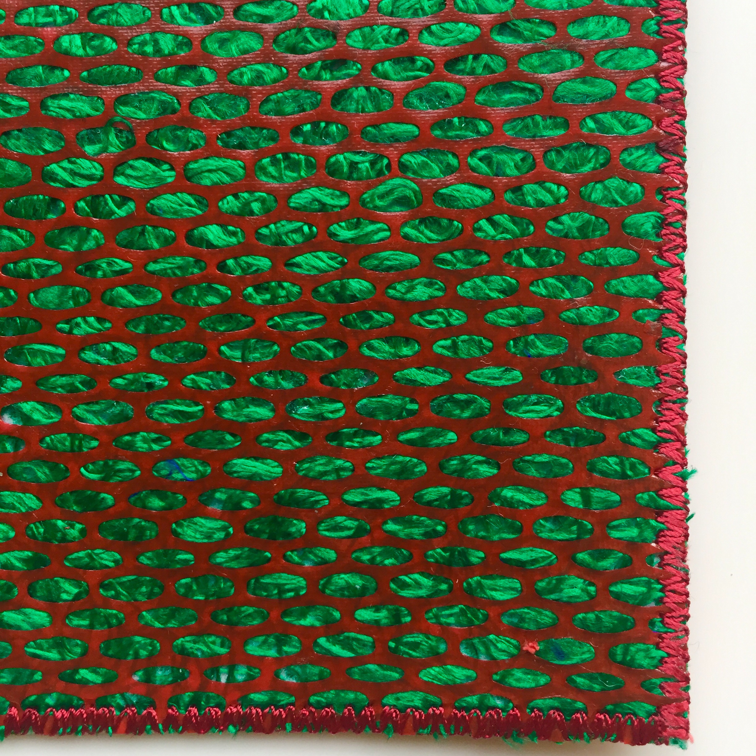 Here is a fun way to upcycle silk thread left from fringing pieces of silk dupioni and that red plastic mesh that comes on crates of clementines! Do not throw that mesh away…it melts very nicely into fabric to create cool effects.