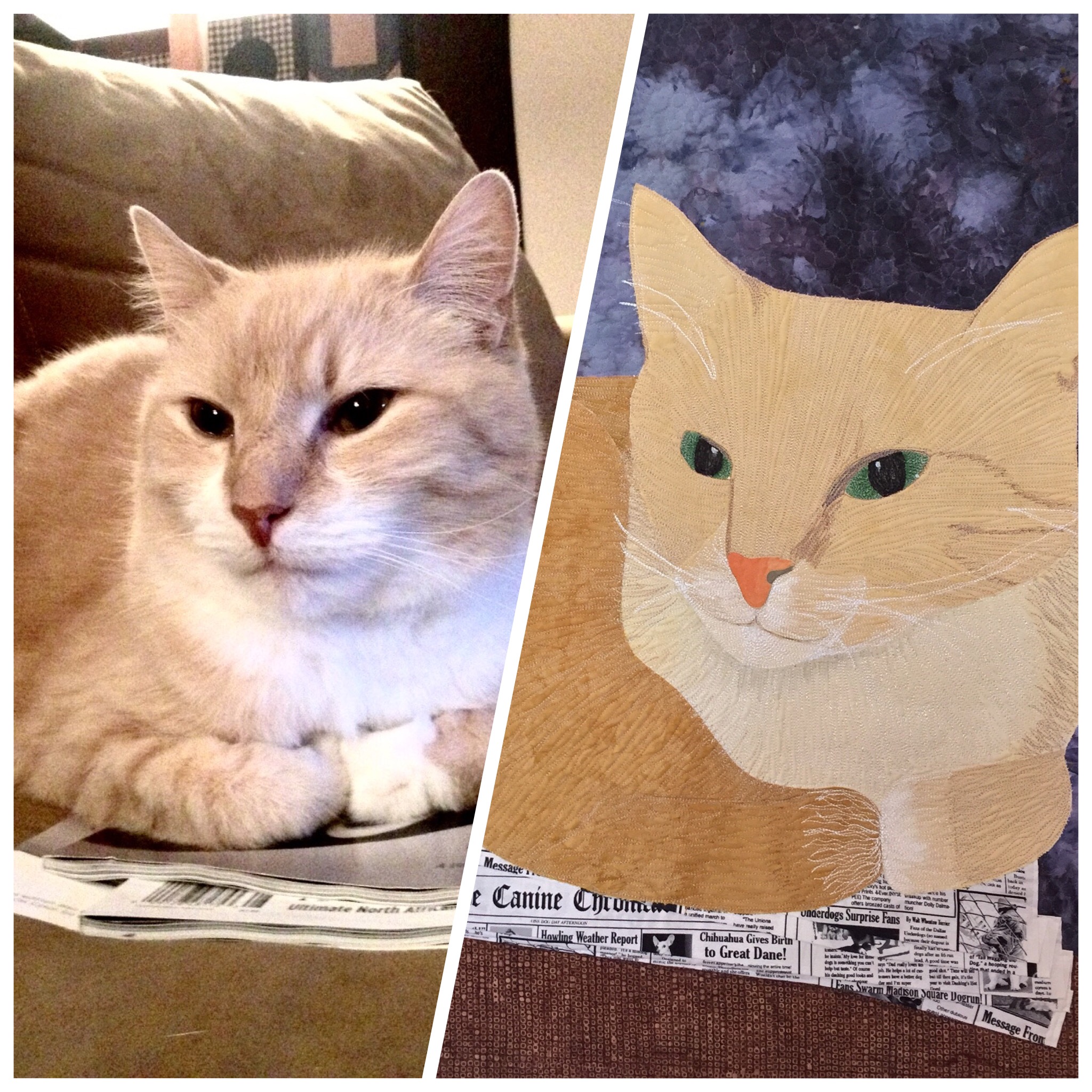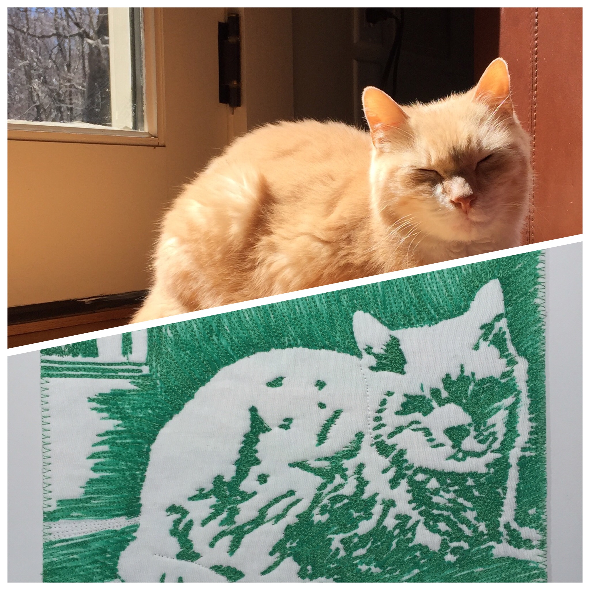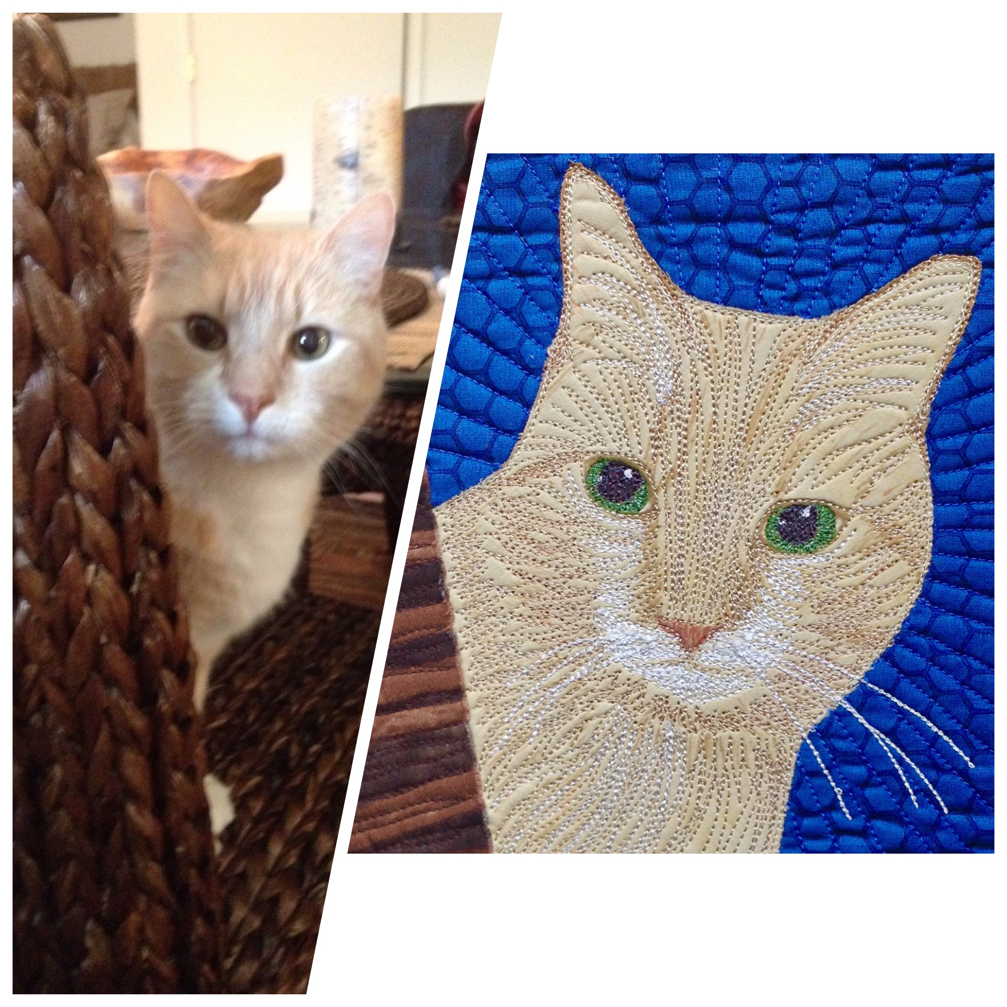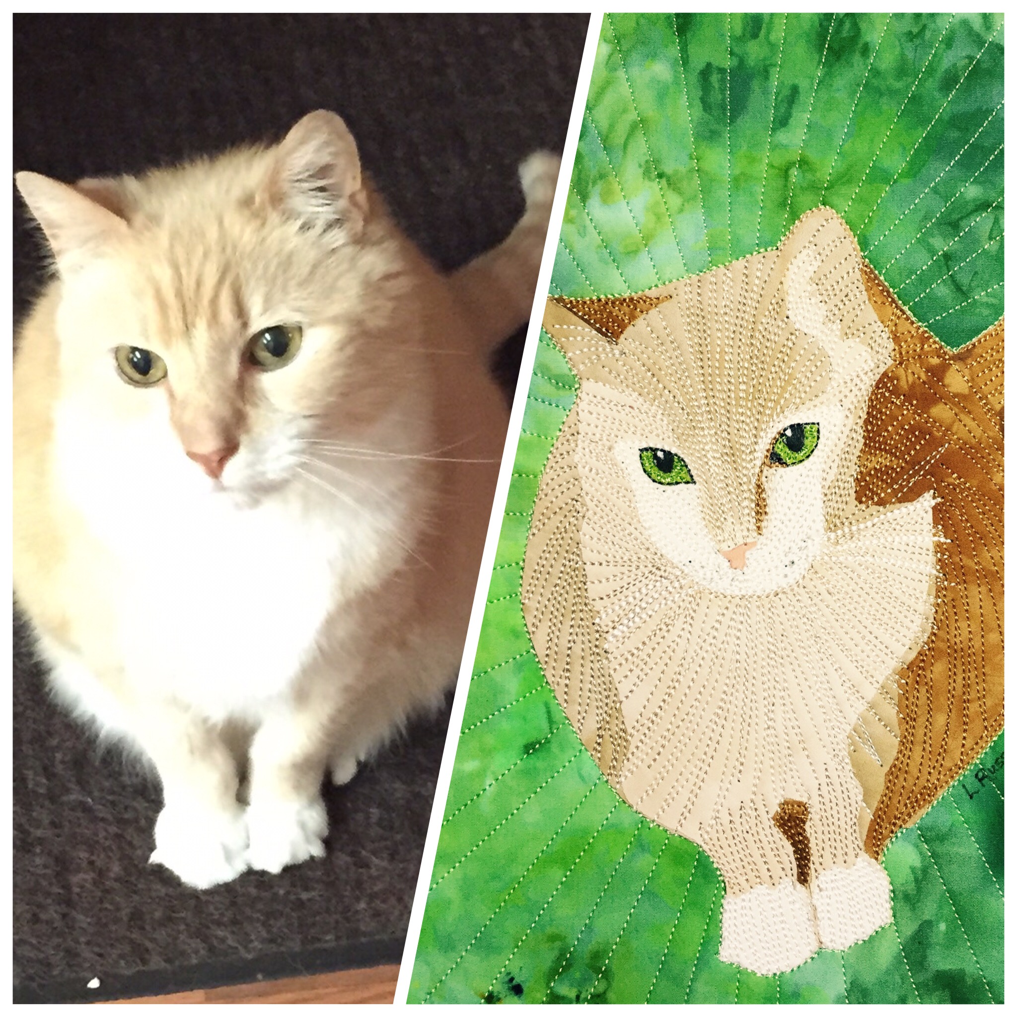 For me, very dramatic faces are easier to explore on a large scale. My feral sidekick…the cat behind the original Neon Kitty quilt…has an incredibly striking face. Cleopatra would have envied her ‘eyeliner’ ;). Our adventurous black cat may be monochromatic but his enormous emerald green eyes speak volumes.