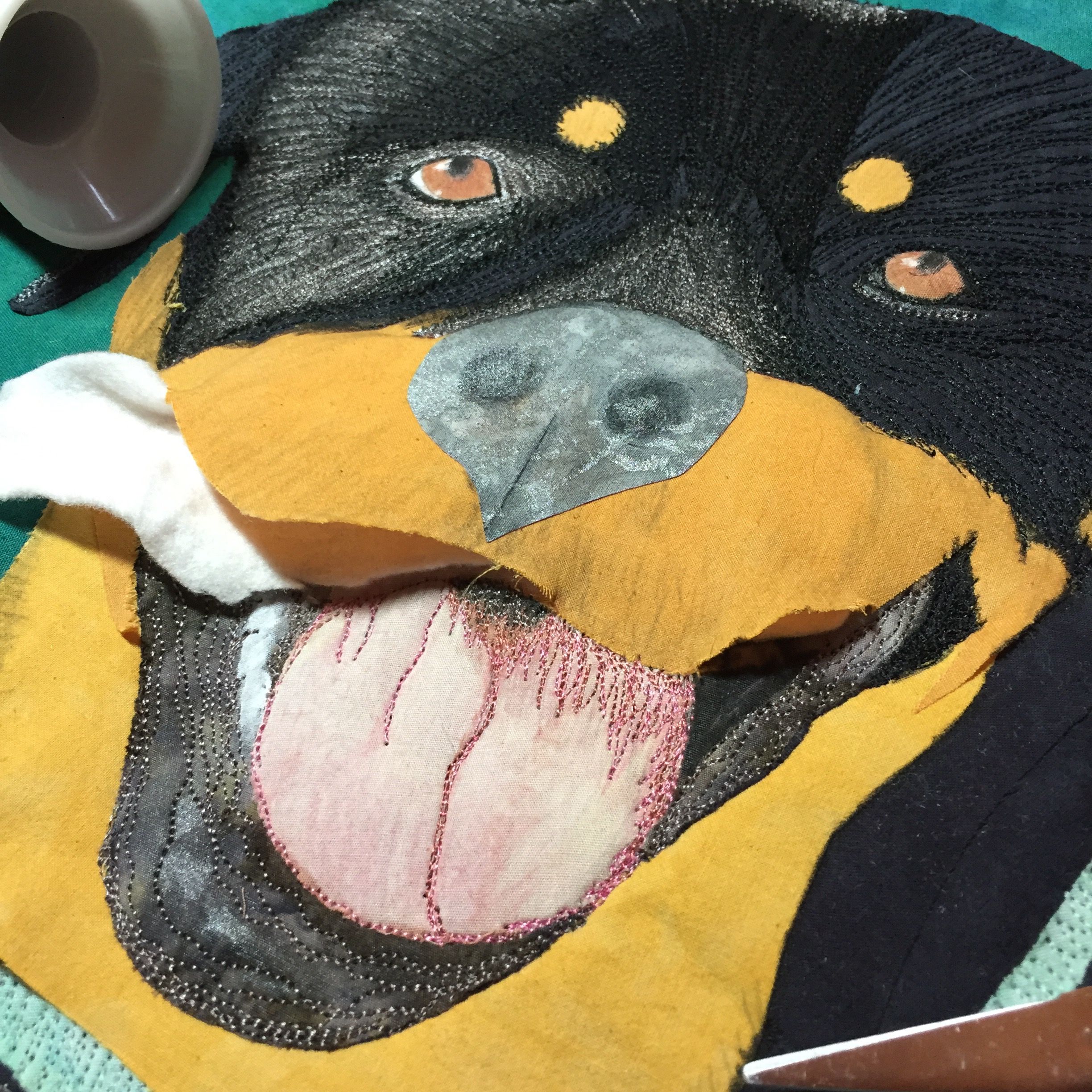Then, lots and lots of “fur” stitching…and the addition of an extra layer of batting for his snout (another reason to love MistyFuse – the ability to lift layers and compose as you go!):