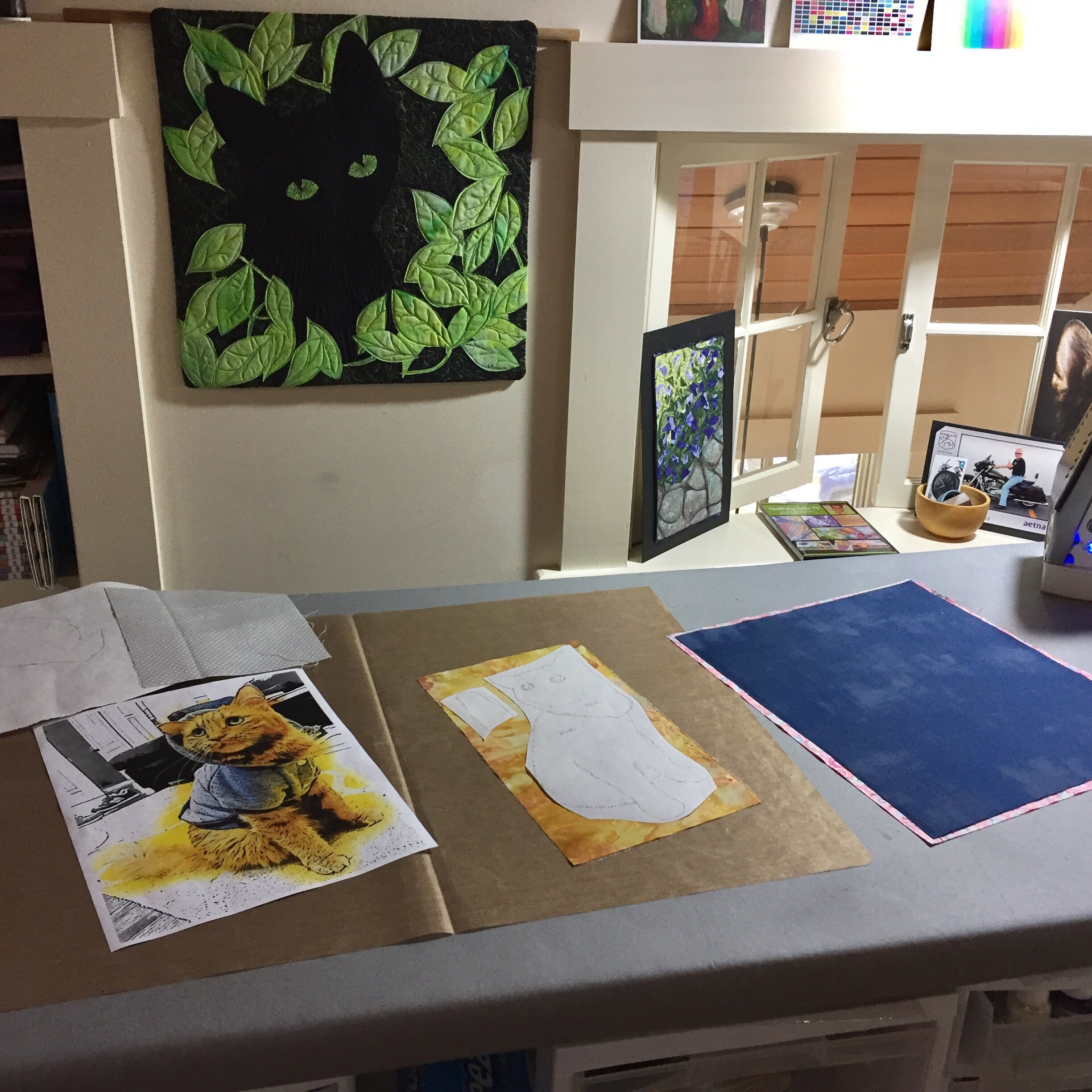 Then, select fabrics. This was easy because I had a small but spectacular piece of Carol Eaton’s ice-dyed fabric that was perfect for Poof’s fur…and a light grey print from Janine’s first collection was just right for the sweatshirt. (We pause for a moment to consider how many of our cats would allow us to dress them…) The only real question for me was, which background fabric? Since her fur would be variegated, I wanted a simpler backdrop…