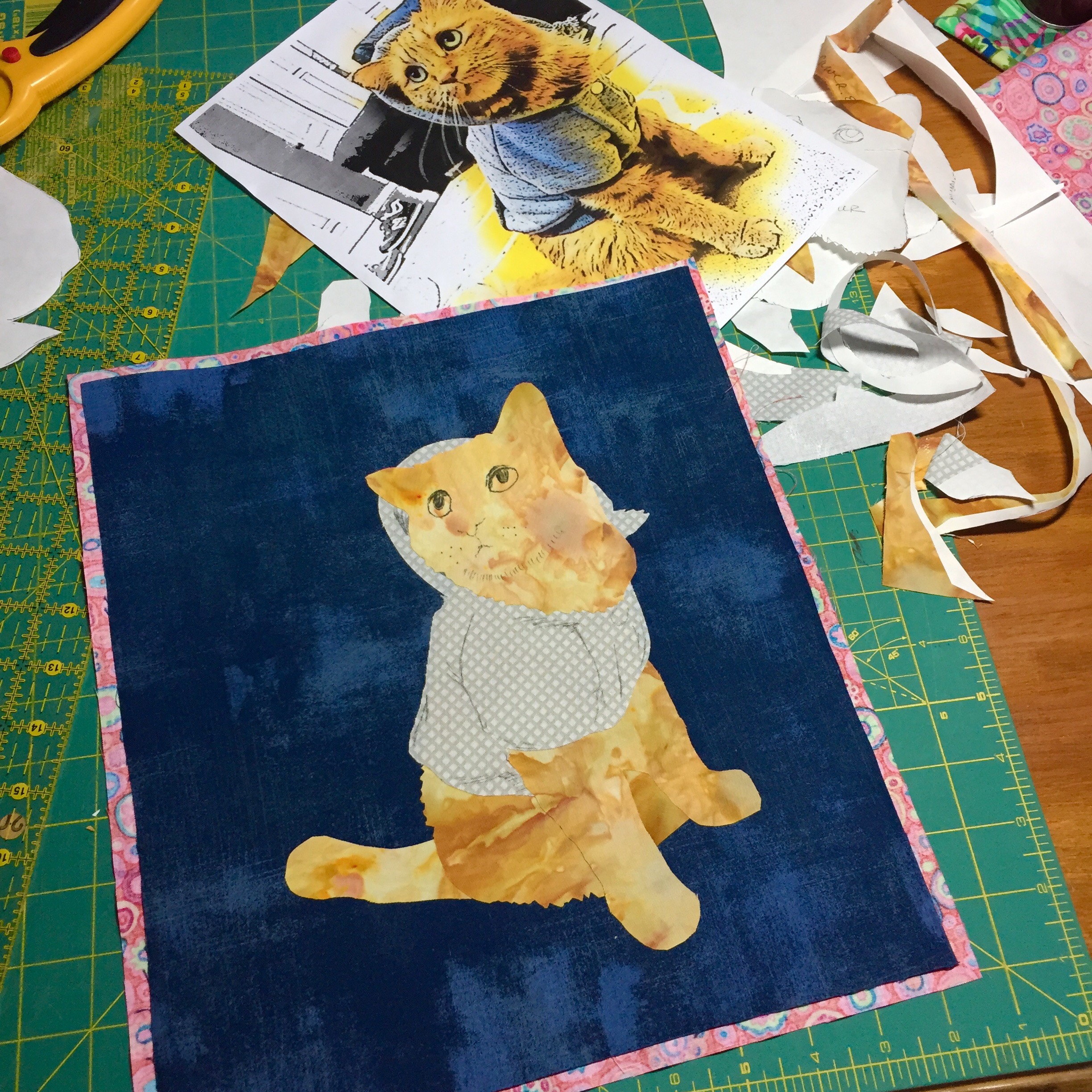 I traced the outlines of Poof and her sweatshirt on freezer paper, then decided the fabric was light enough to trace in the features directly on the fabric before fusing to the background…
