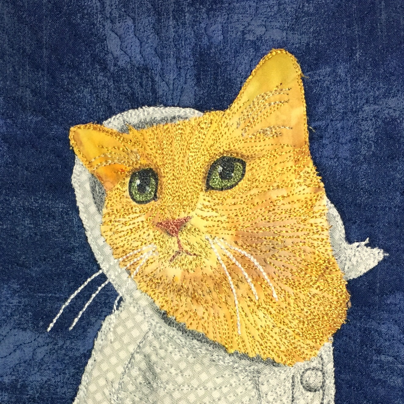 The marvelous thing about ice-dyed fabrics is the variation in color…it was easy to position the pieces to mimic lighter and darker fur. Then, of course, lots and lots of thread! Glossy polyester for her fur…Aurifil cotton for sweatshirt, background and whiskers ;).