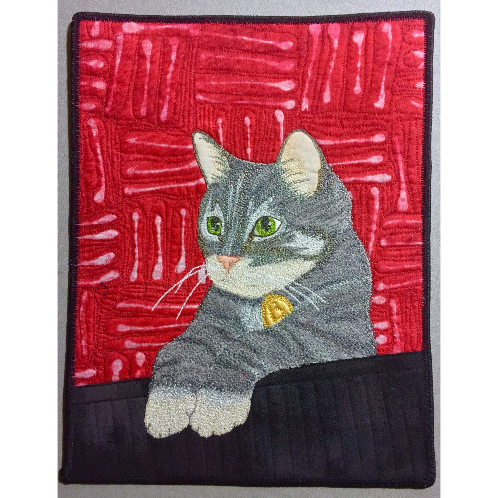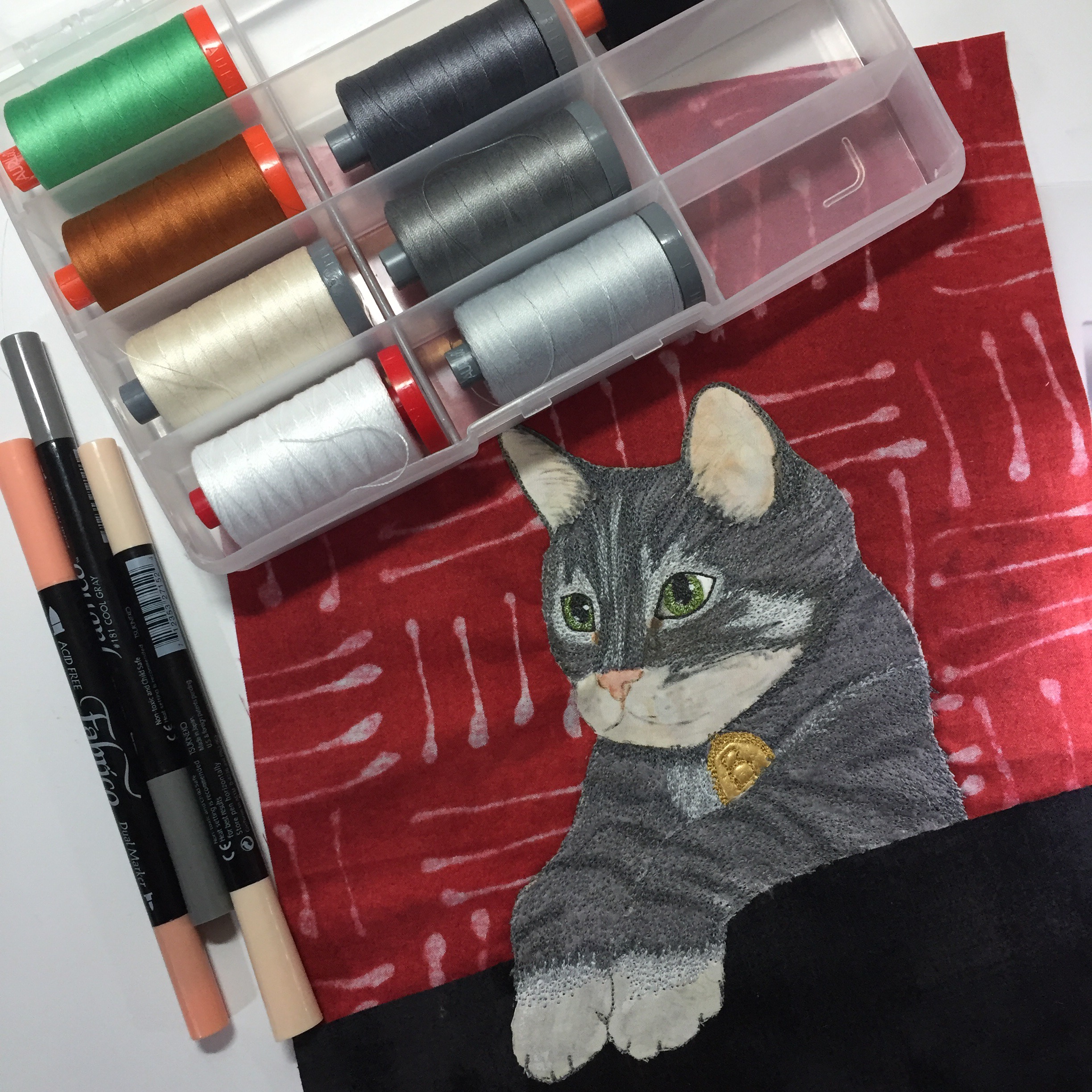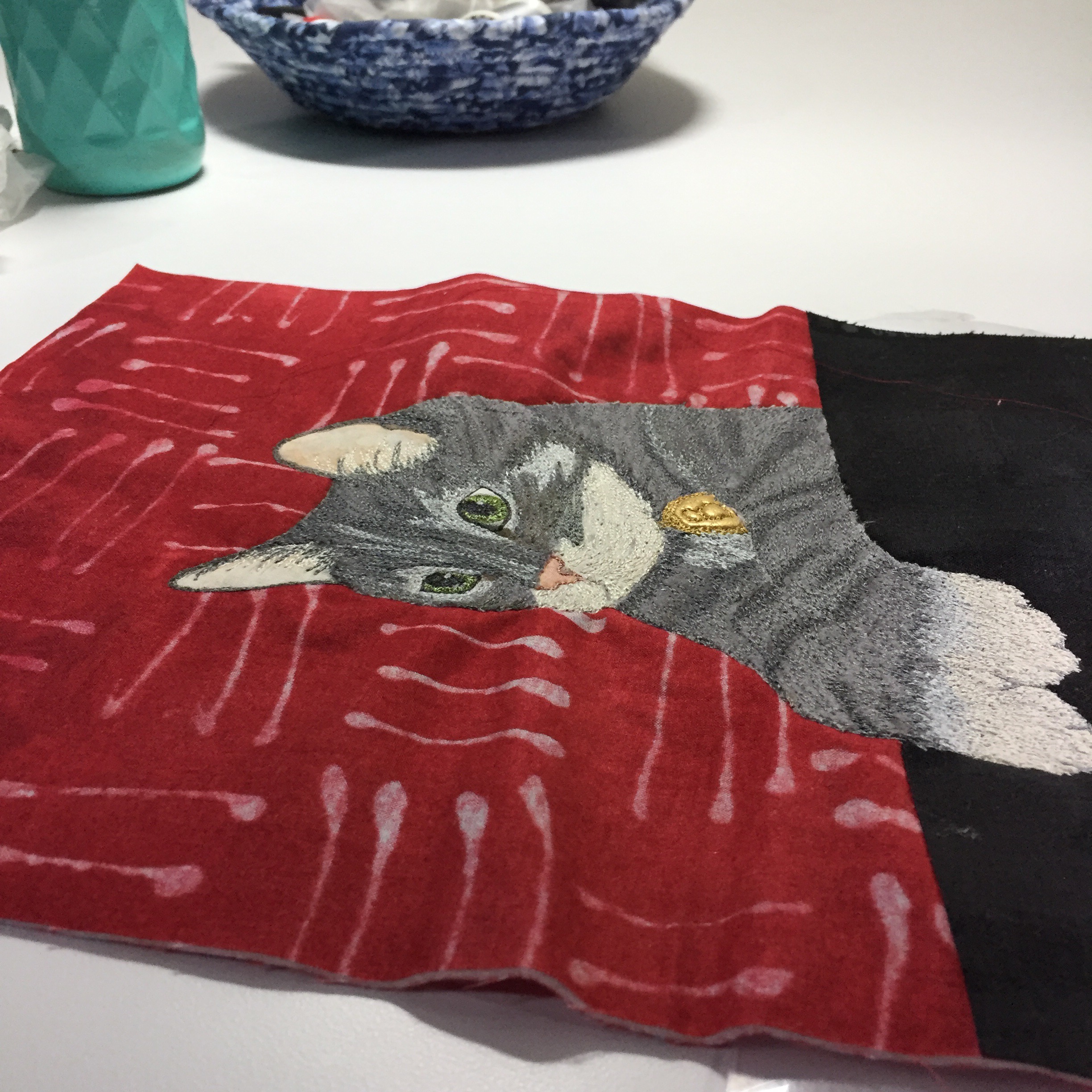 The more shades of thread you use, the better the effect…ditto different weights. I use a number of spools from the Aurifil thread box I curated for my pet portraits :)…try 40wt for fur in multiple shades of the main fur color, and 12wt for the best whiskers! Of course after you complete your subject’s fur, the background will look a little wavy 😂: