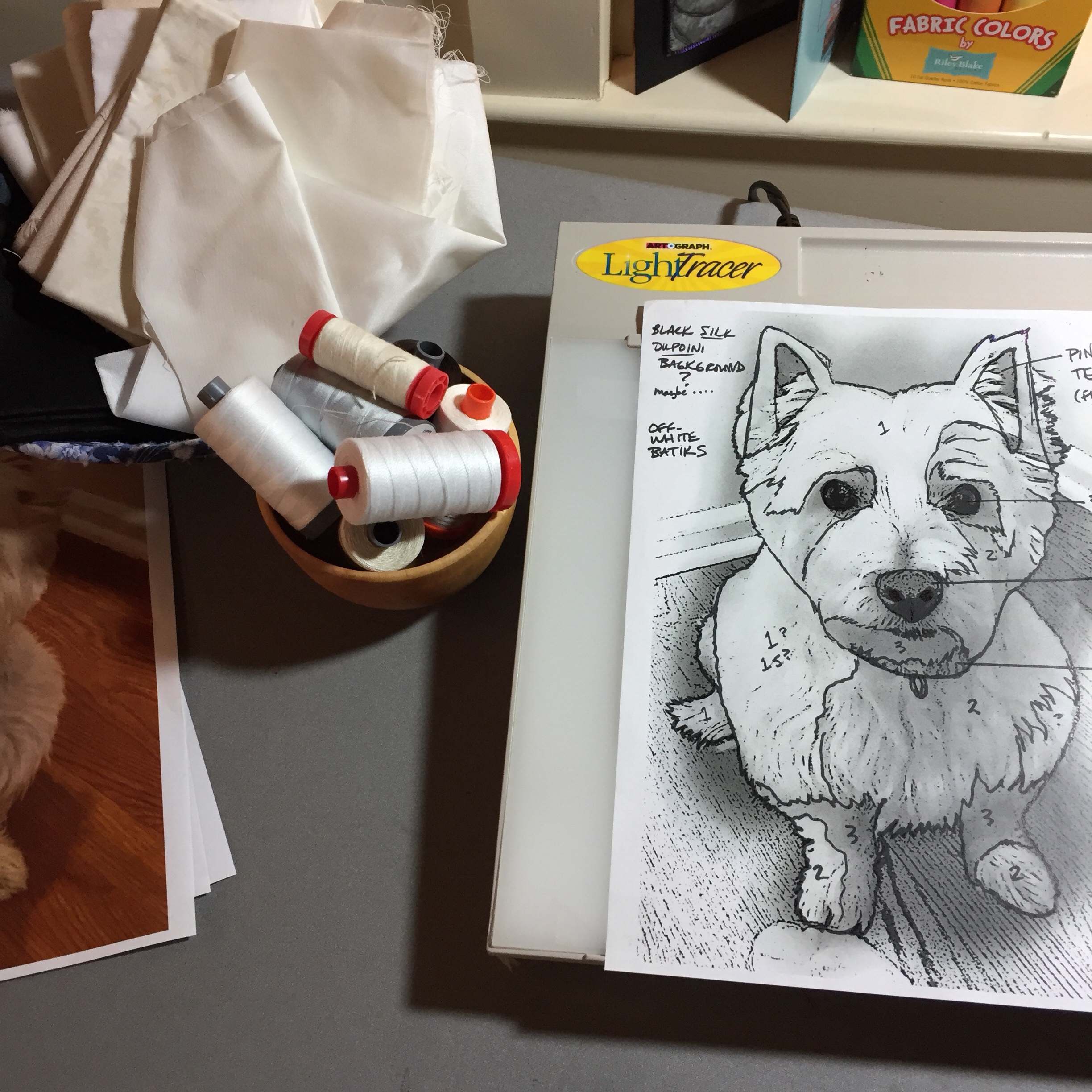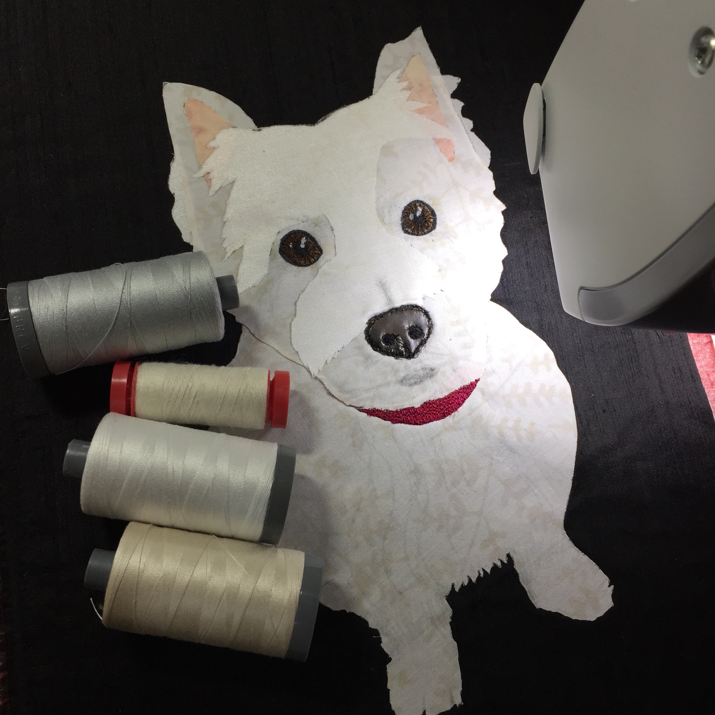 I like to ink in the subject’s eyes first…and add any other necessary bits (here, a scrap of leather for her nose, pieces of pale peach for her ears, and a piece of silk ribbon for her collar) before revving up my Bernina.