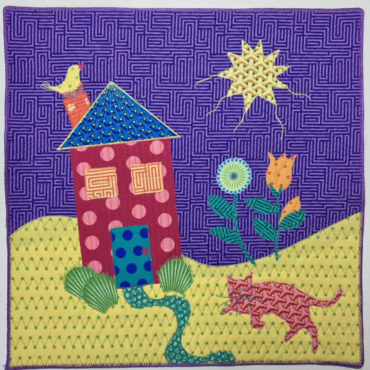 Time to quilt! Sometimes I followed the fabric’s pattern, sometimes stitched in a counterpoint (such as my rectangular “bricks” on this dotted house).