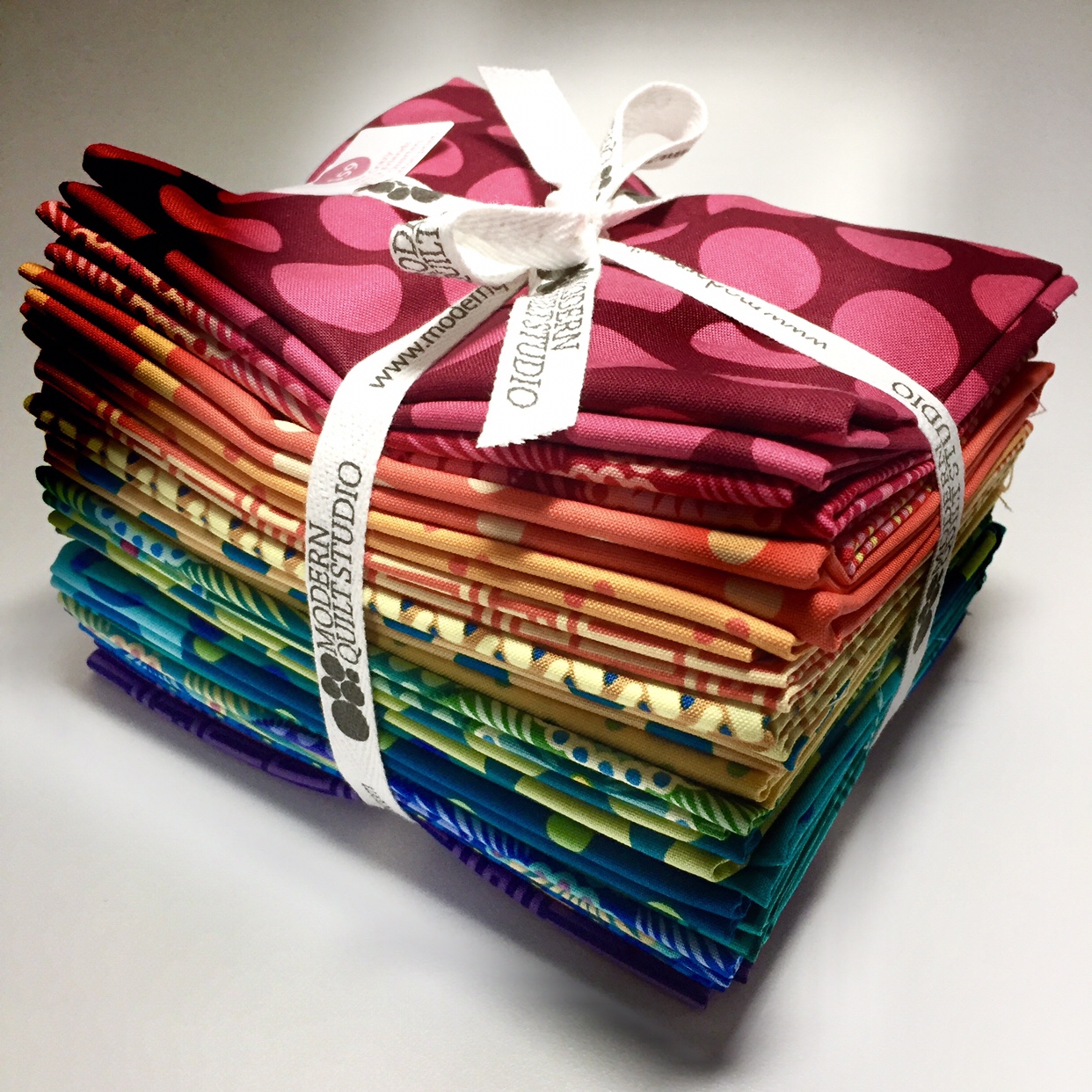 For this series, I decided to play with a stack of (very colorful) fat quarters from the very talented folks atModern Quilt Studio…this collection is called “Dot Crazy”.