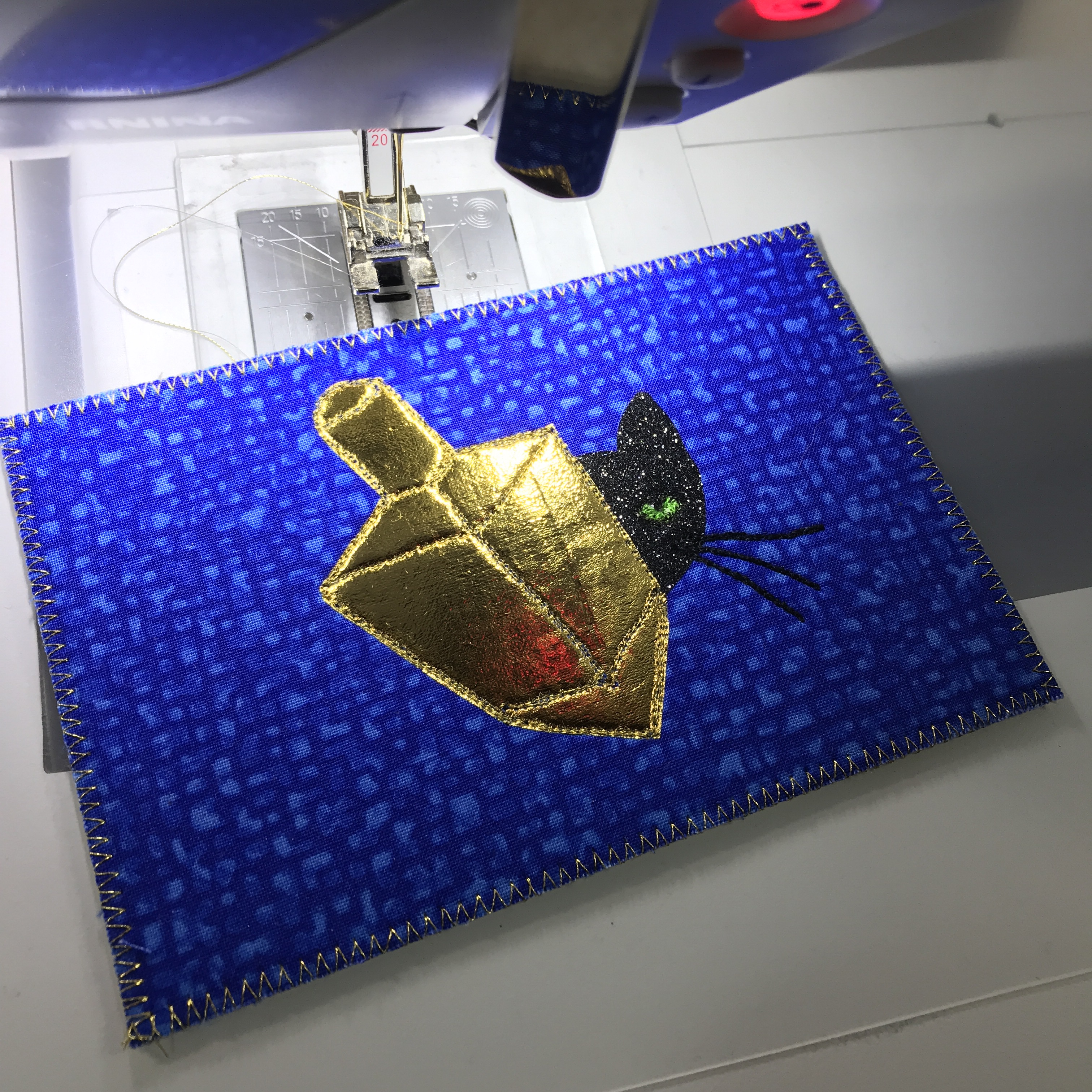 A little free-motion stitching: the outlines of the dreidel…Jackson’s eye and whiskers (the latter in 12 wt Auriful for maximum effect)…and we’re almost done! Pick a fabric for the back of your postcard, fuse, trim to size and finish with a zigzag stitch (I opted for a gold metallic thread).