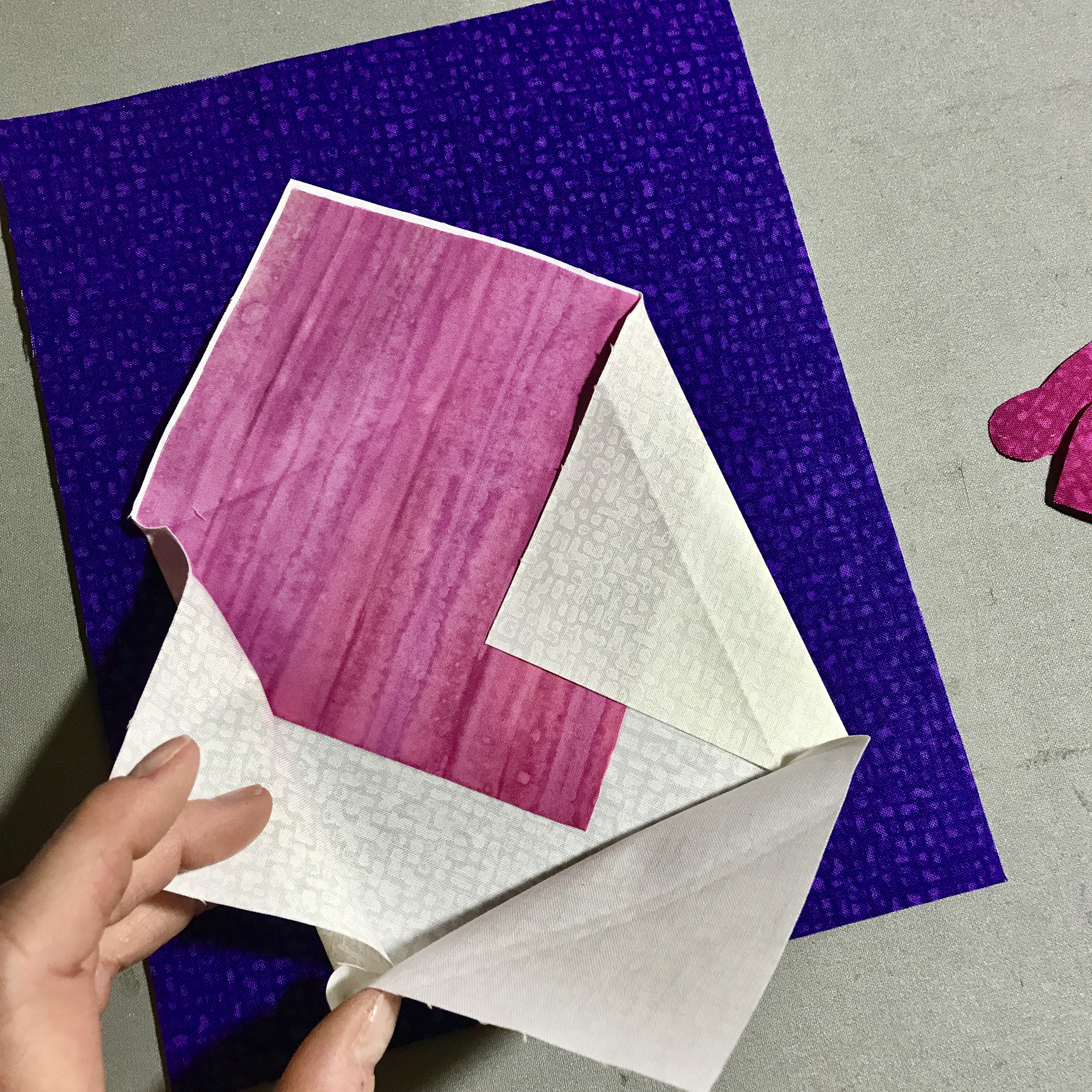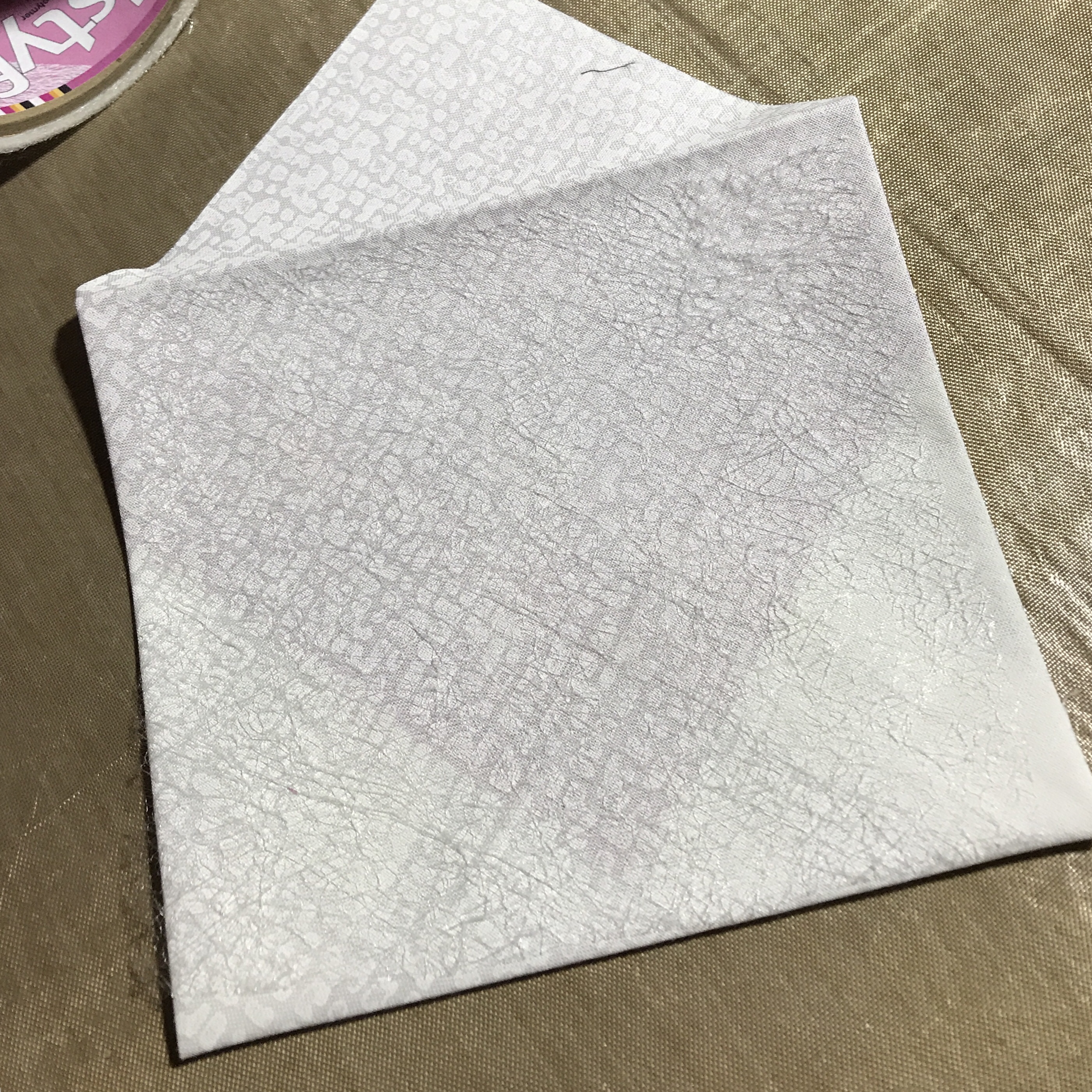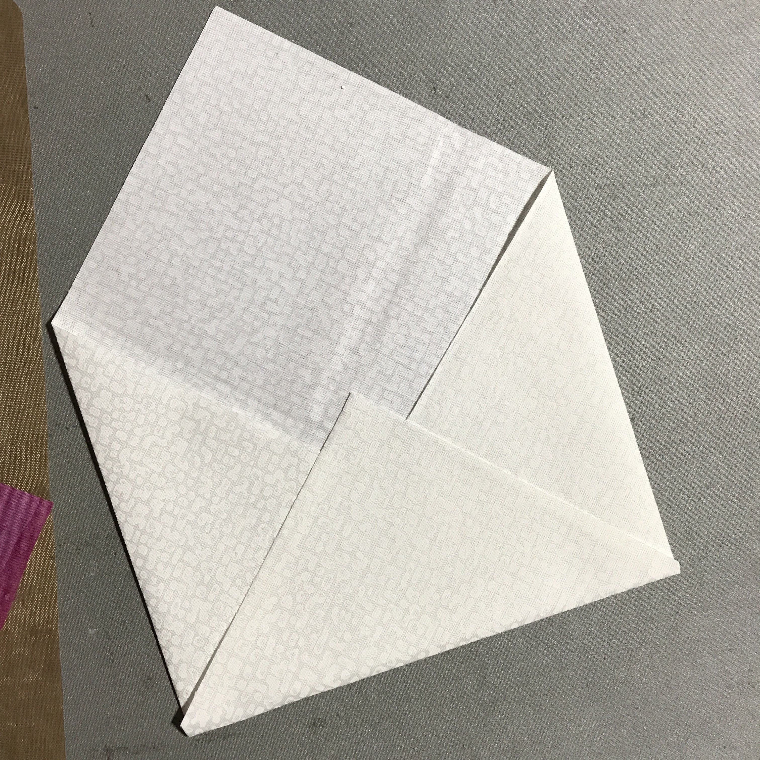 Cut an 8″ square of the white fabric, and press into the shape of an envelope-