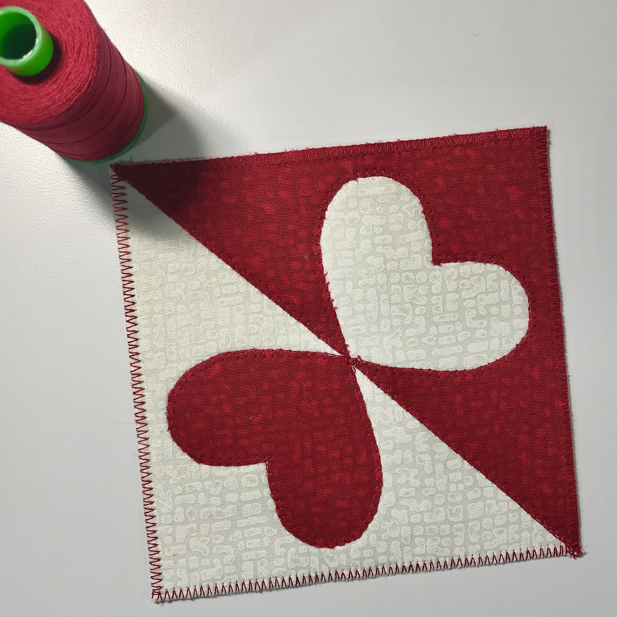 No time to sew? No problem! This Valentine project is a super-fast one… 3 charm squares, some MistyFuse, a 5″ square of batting and a spool of gorgeous thread and you’re off and stitching!