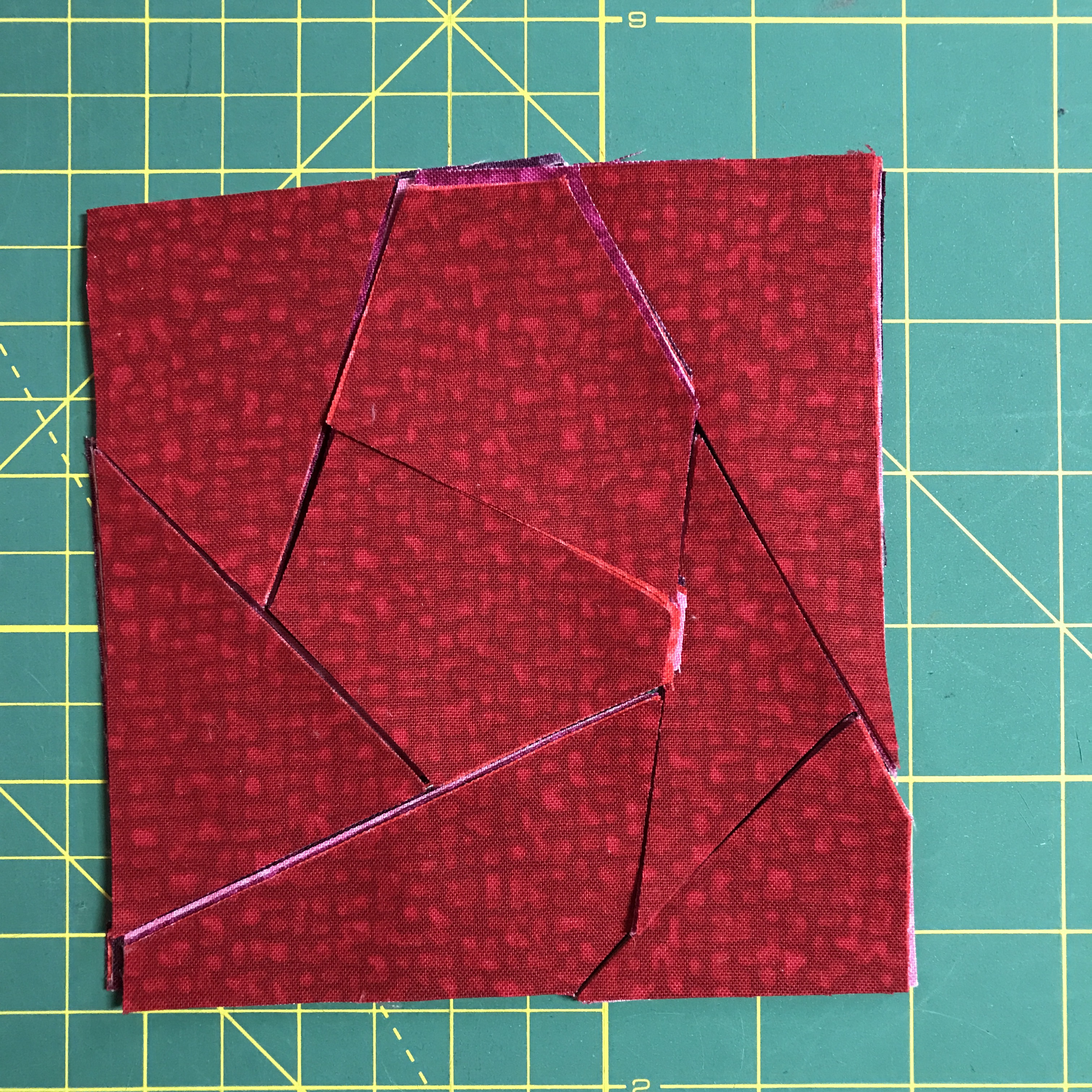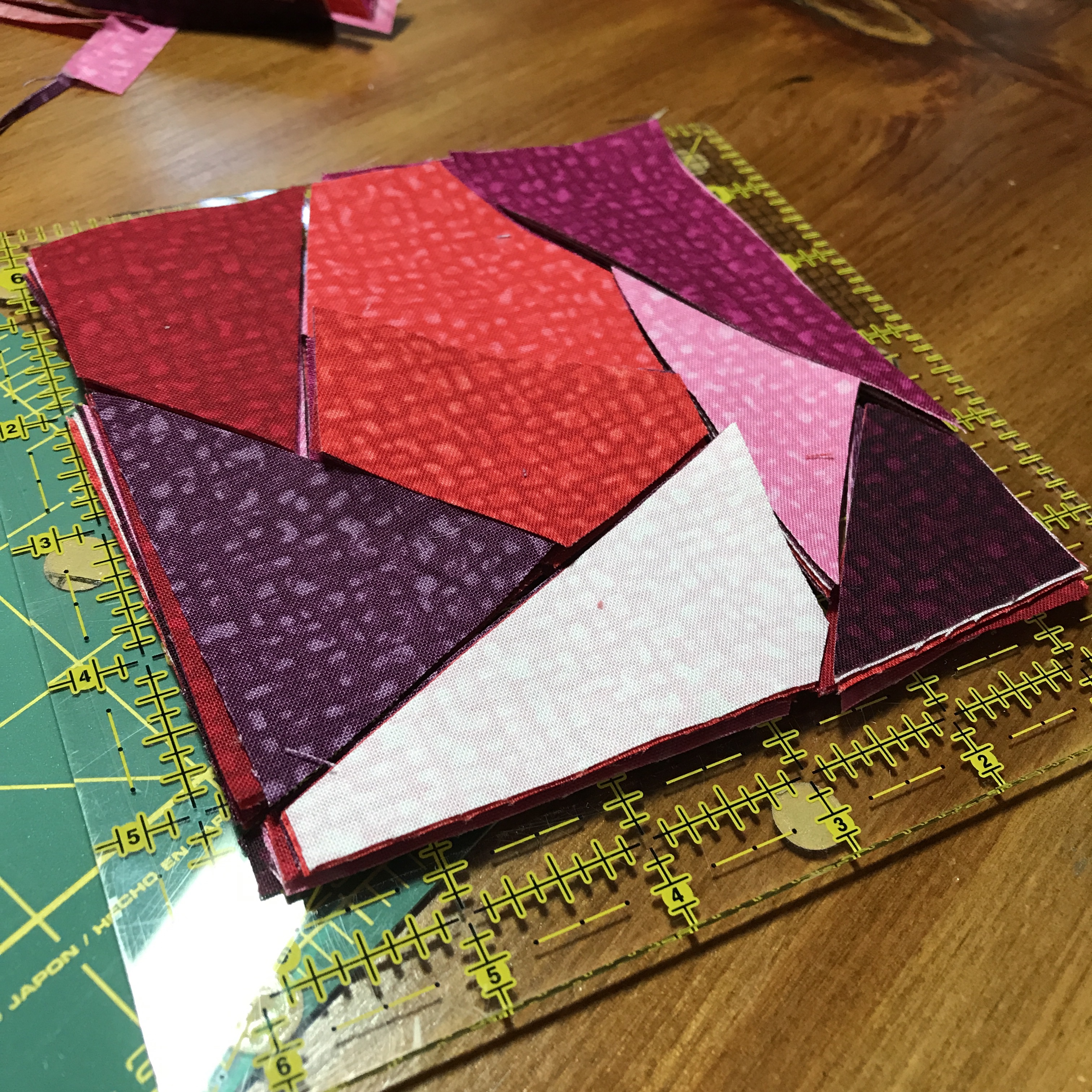 …which I found to be a great way to begin to learn how to construct crazy quilts. The concept is that you stack your fabrics, make cuts, then re-arrange the order in each little ‘deck’…next, take the each new layer and lay them out to become a block.