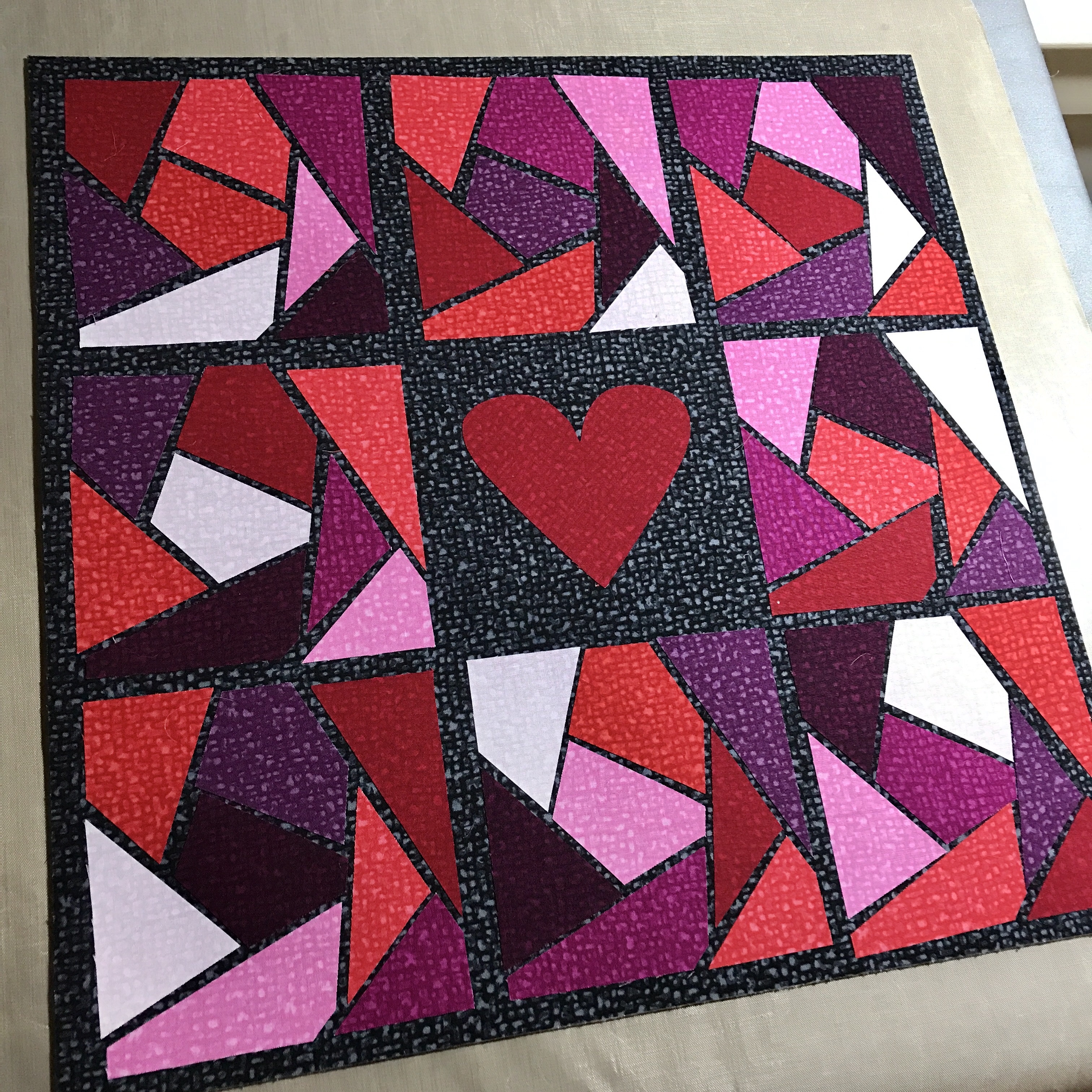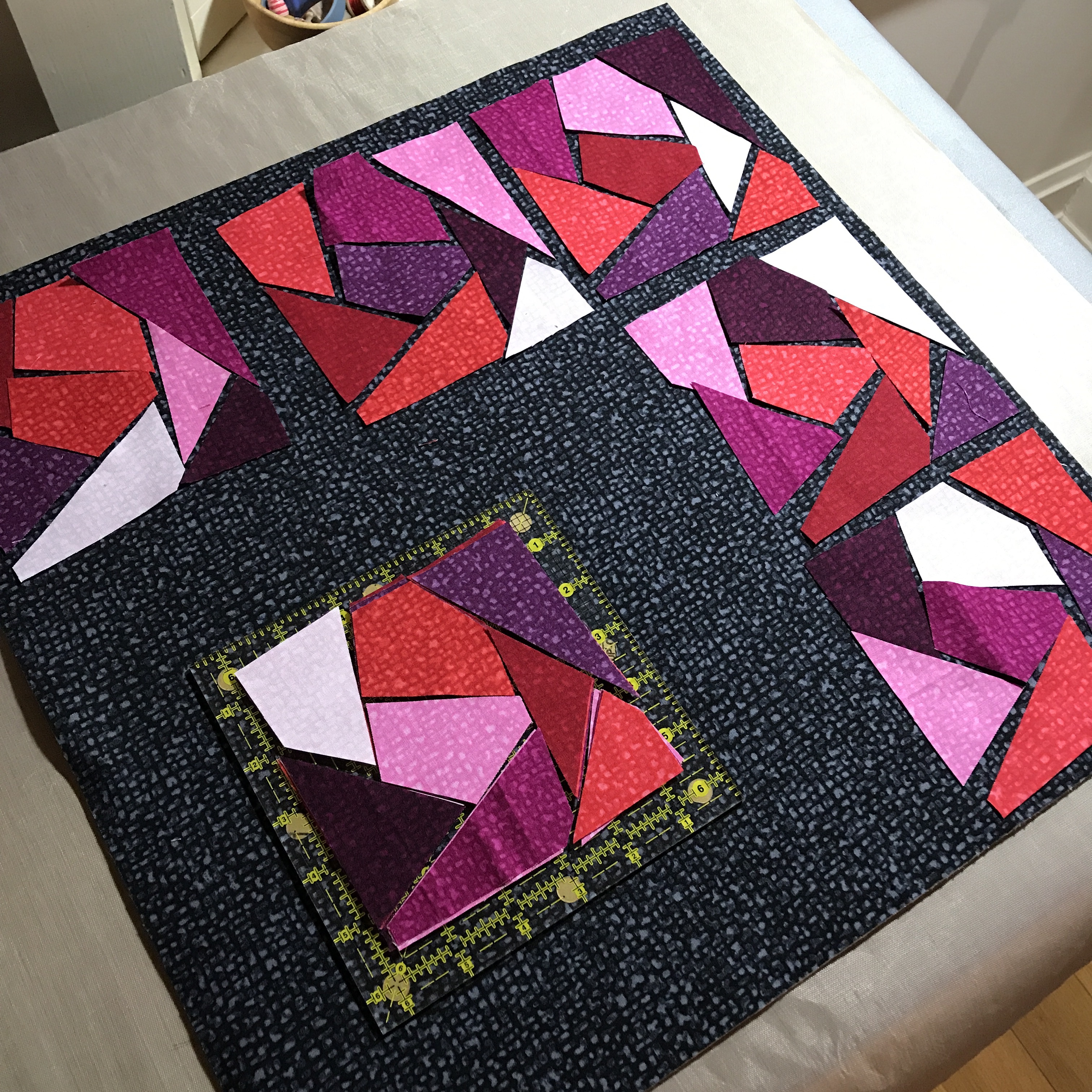 I used Windham Fabrics’ blender collection and pulled black for a background, then 8 Valentine’s shades to create the faux blocks. Because, hey, if I can fuse instead of piece, I will 😉! MistyFuse all, fuse black to a piece of batting and backing (here, an 18″ square but you could size up or down), then fuse and trim the colors to 5″: