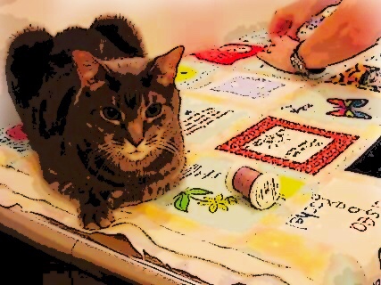 And I began to sculpt it around him (thank God for MistyFuse). After struggling with the layout, I reverted to a more traditional rectangular shape. But…it occurred to me that, instead of fur, I could stitch in some of the story about how GL came to live with us. Hmm. So, first I quilted him separately, stitching in each word…then placed him onto the backing and quilted his furry edges and some lines of his body. This allowed me to keep him more 3-dimensional. As always, creating the eyes was my favorite part :).