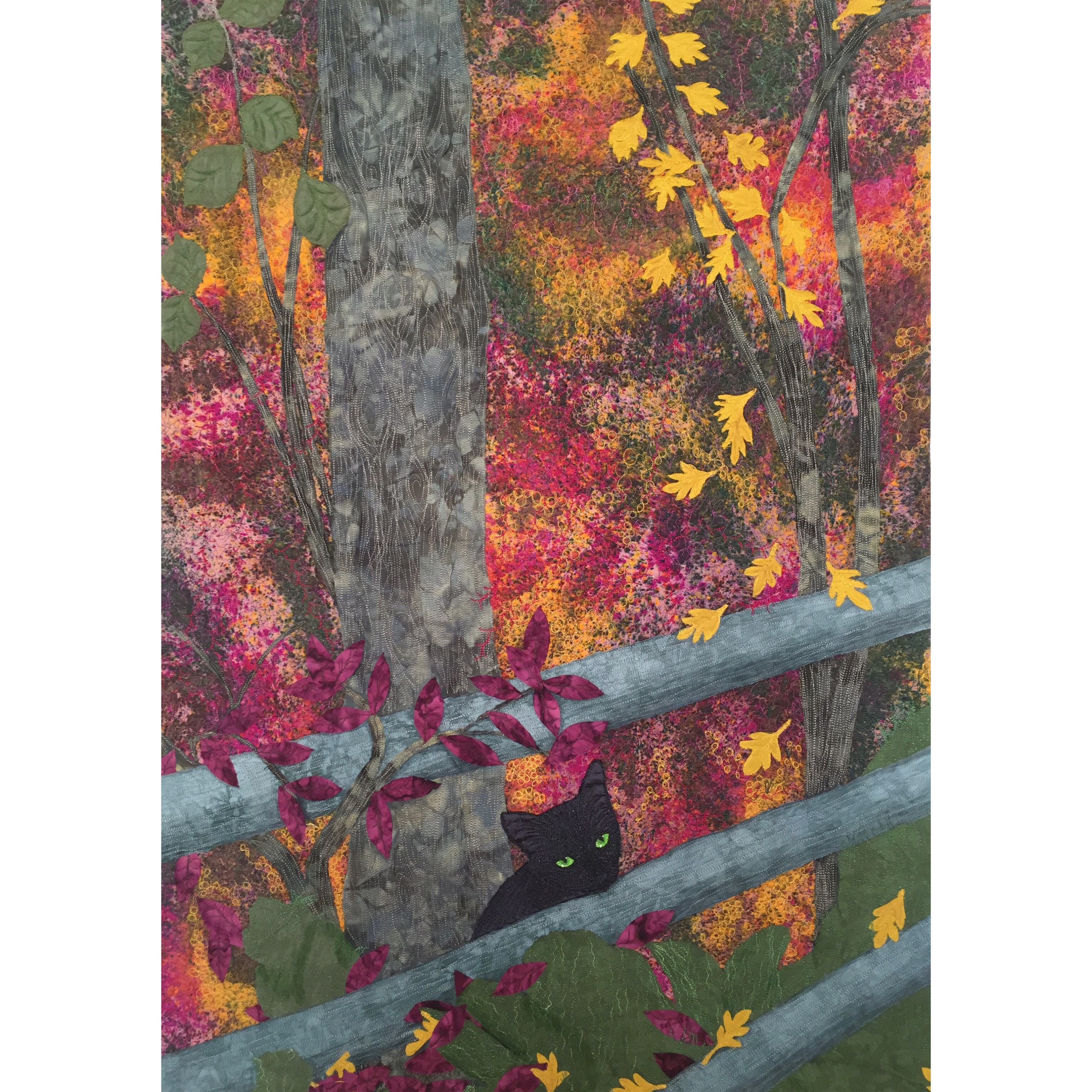 I certainly had my background! I quickly ripped pieces of other (Misty-Fused) hand-dyed cotton to represent the trees and the rail fence. Of course, Jackson had to make an appearance: