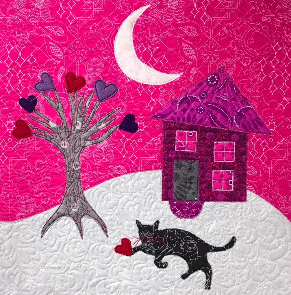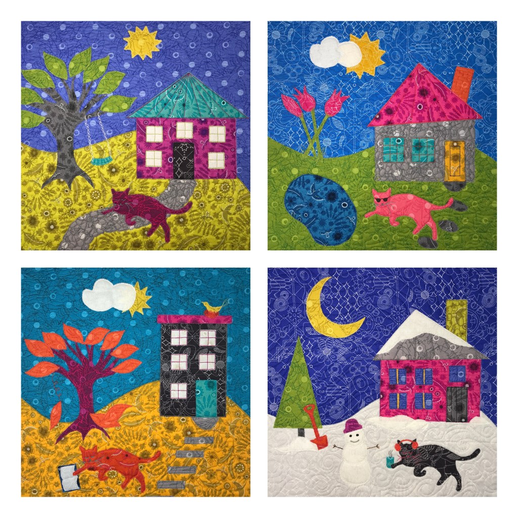 Is there anything more fun than small, playful quilts for a great cause? In this case, the organization Furnishing Hope…thanks to Jamie Fingal’s work, hundreds of art quilters have created 14” square home-themed scenes to brighten the homes of formerly-homeless women and children.