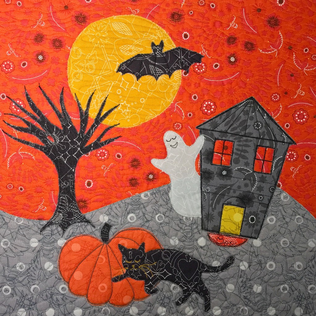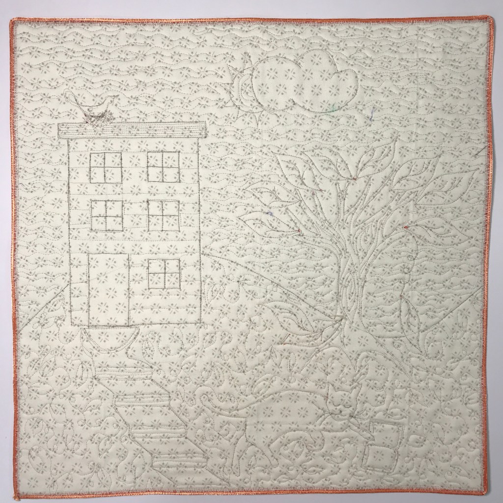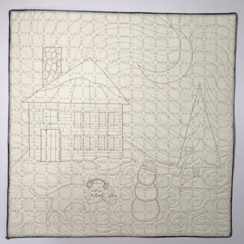 By outlining each component of the scene, you can add a great deal of surface interest. I always use monofilament in my bobbin to accommodate the frequent top thread color changes, but the quilting is still visible on the backs of these pieces. These quilts are a fantastic way to become comfortable with free motion quilting – small enough to be very manageable and perfect canvases for pebbling, lassoing, etc.