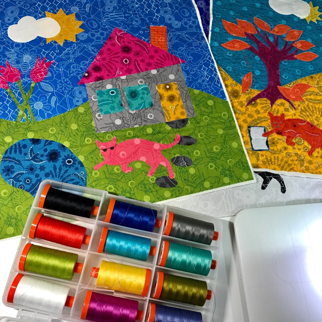 Fuse all, using your nonstick Goddess Sheet https://www.mistyfuse.com/collections/goddess-sheets so that you don’t fuse anything to your pressing surface ;)…and your little quilts are ready when you are. Next step, thread…oooh one of my favorite parts ;)! I enjoy understanding each fabric designer’s palette by selecting the Aurifil shades that are closest to their hues; Alison’s pinkish-purple is completely different from Tula Pink’s pinkish-purple.