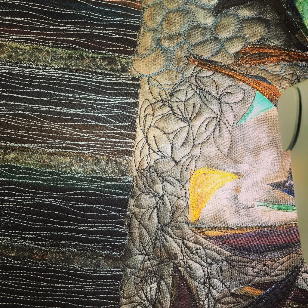 The leaves were fused at the bottoms of each of the “trees” and then scattered. Lots of PaintStik and fabric ink later, the “ground” looked dark enough to begin to stitch the piece. Thread time, my favorite…I found that Aurifil’s variegated brown/black 28wt thread was particularly helpful for the tree trunks. (I keep several of their plastic containers around and tape a photo of the project for which the thread palette has been gathered…it’s a fantastic way to stay organized when you are working on multiple projects!)