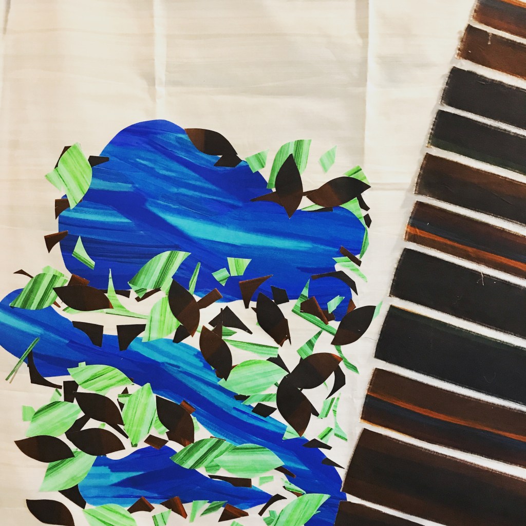Instead of drawing a horizon, I decided to create it with trees. One of the many joys of Mistyfuse https://www.mistyfuse.com/collections/mistyfuse-10yd-packages-1 is that you can ‘sculpt’ the fabric by pressing it, lifting, shaping, and pressing again – in the case of tree trunks, creating creases to resemble bark. So, snip, RIP!, shape: